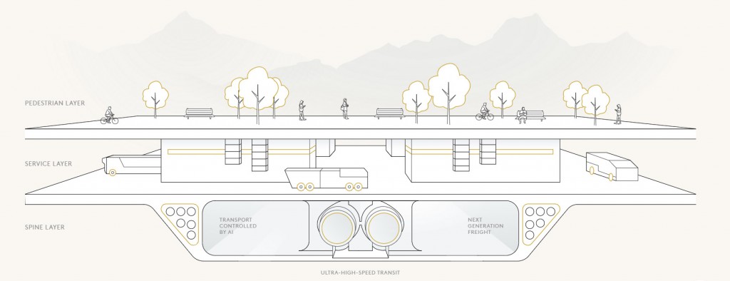Ce système de gestion consistera en un grand corridor vert qui fonctionnera comme une artère de transport autonome et durable, éliminant la présence de voitures individuelles. Le plan directeur créera également un « écosystème organique interconnecté et centré sur les personnes », où les frontières entre les environnements de travail et de loisirs sont floues.