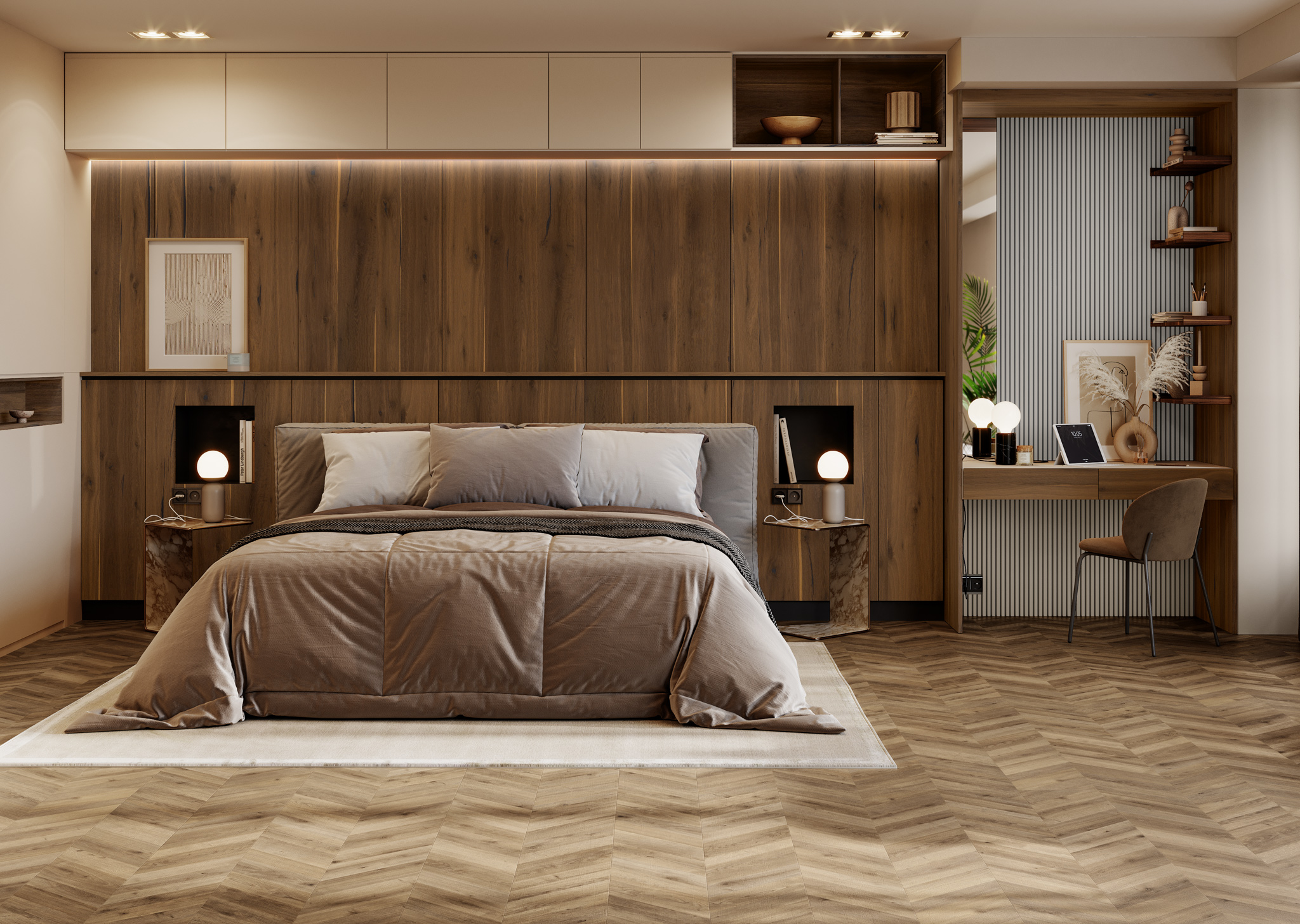 Esta habitación con escritorio-tocador está compuesta por materiales naturales y elegantes que nos transmiten la herencia del pasado como un valor seguro.