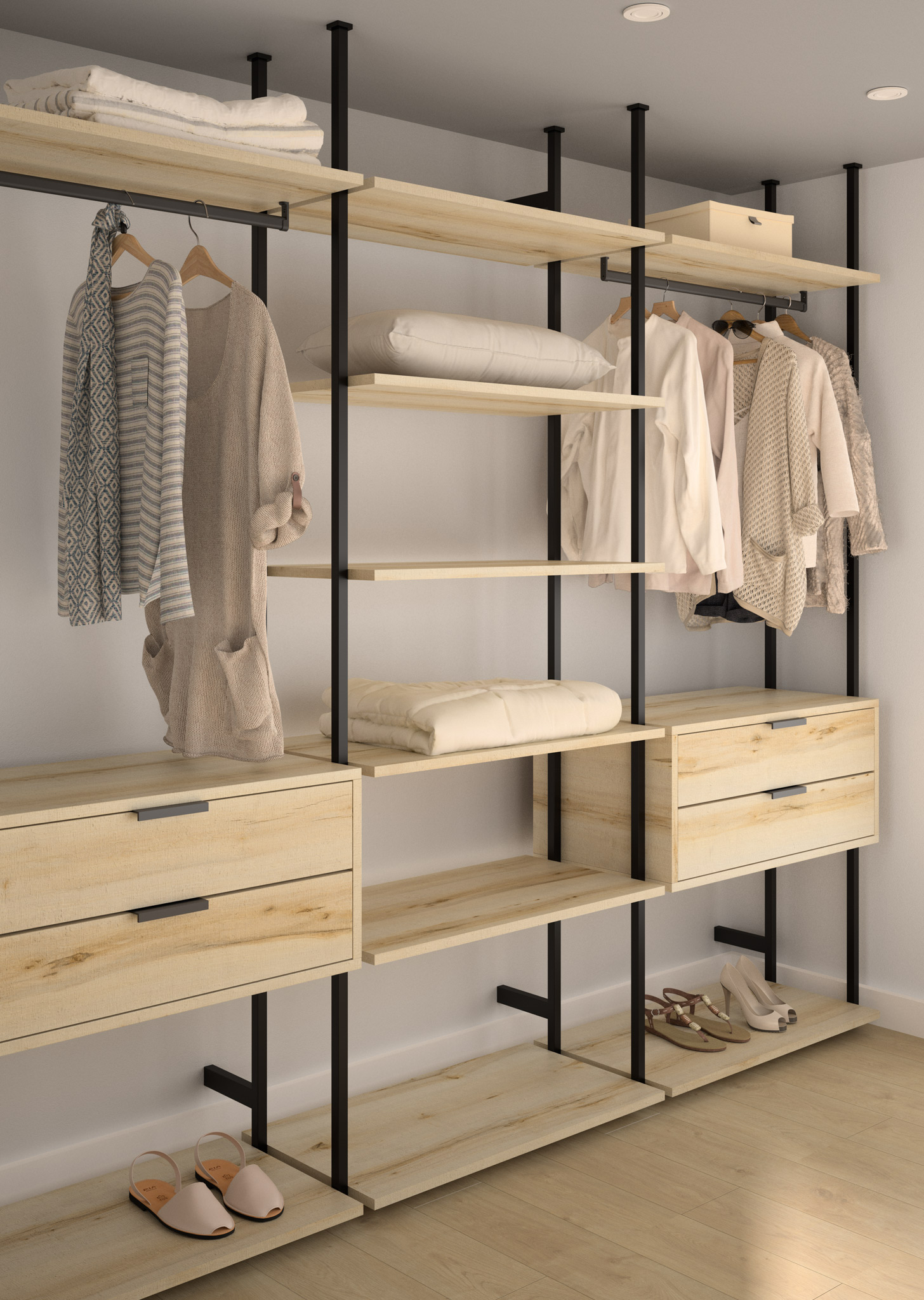 La naturaleza entra de lleno en el espacio gracias a este armario flexible, hecho con materiales de apariencia robusta, pero que a su vez son capaces de transmitir una gran delicadeza. Destacamos la disposición de interiores a la vista.