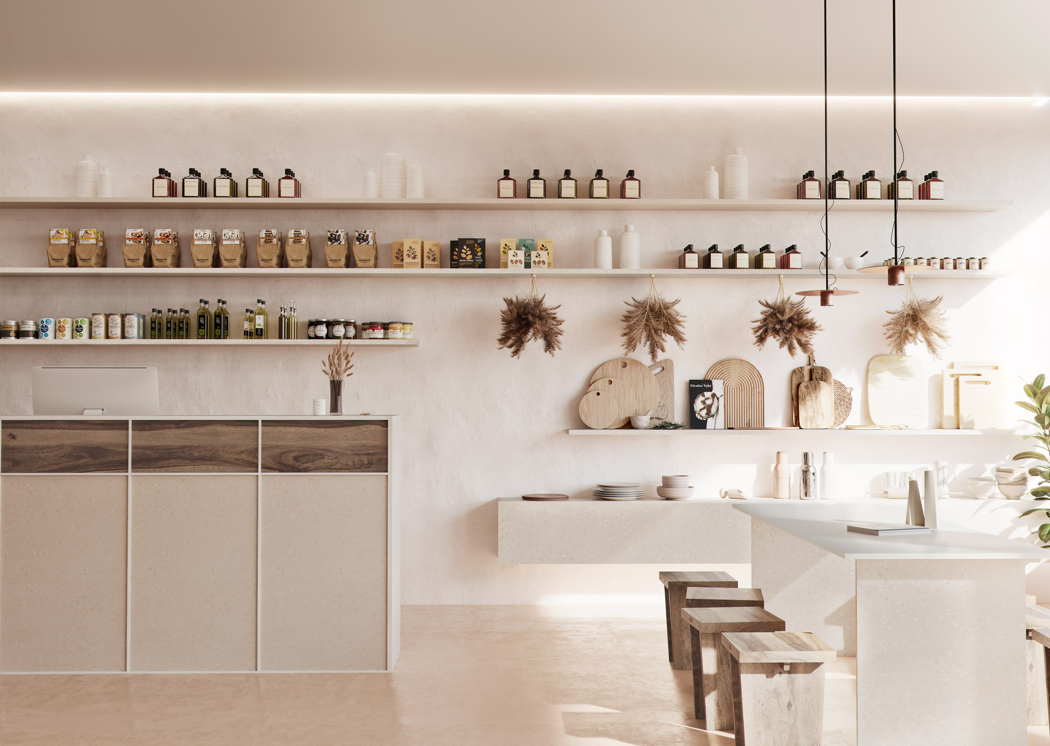 Una tienda de barrio que anime al consumo local y responsable puede encontrar como materiales aliados las piedras cálidas y contemporáneas, usadas en múltiples hábitats como los centros de cuidado personal para transmitir una sensación de bienestar.