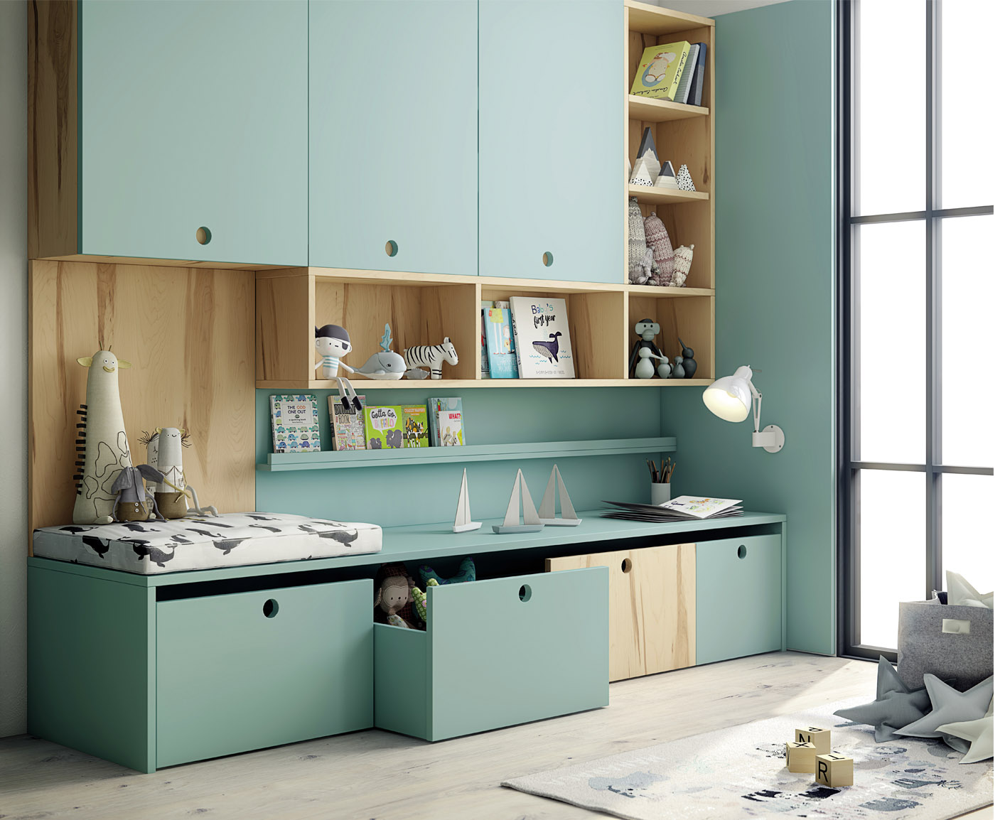 Mantener el orden cuando hay niños puede convertirse en una carrera de obstáculos, por eso dedicarle especial atención a sus habitaciones es fundamental, existen unidades de almacenaje para colgar o apoyar a suelo que en combinación con estanterías diáfanas ofrecen soluciones de lo más funcionales y si les aportas un toque de color tan especial como con el unicolor de la Gama Duo Aqua blue aciertas seguro, esta tonalidad está pensada para sus espacios.
