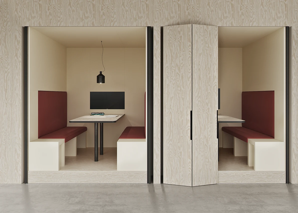 Soluciones para puertas plegables de cabinas o pods de oficina