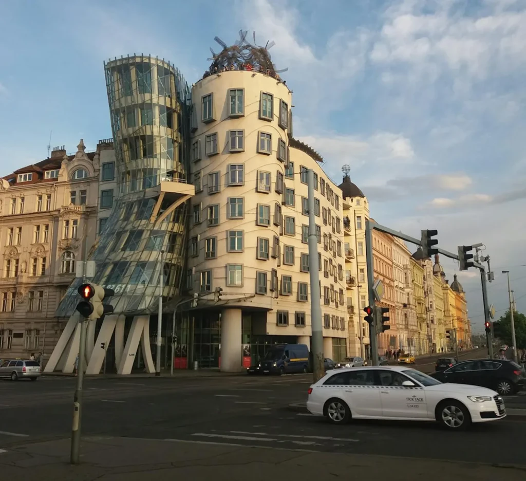 The building, located in the heart of the city (and therefore surrounded by the nineteenth and early twentieth century architecture of that area), is made up of two towers, one made of stone and one made of glass, which appear to be dancing (the architects were inspired by Ginger Rogers and Fred Astaire). It is an office building, although there is also a hotel area and an art gallery.