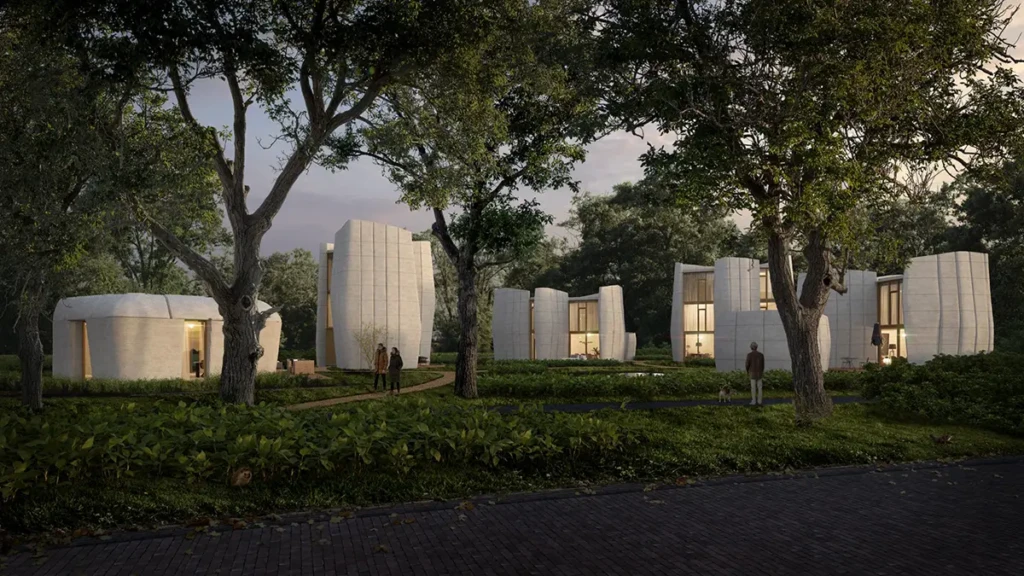 These houses are sculptures… printed in 3D. In 2021, the first tenants of these concrete houses received their keys and became the first people to live in a printed building. The project has been so successful that new multi-story homes will be put up for sale in 2024. The sculptural element, that aesthetic that draws attention, is once again in that search for integration with the nature of its surroundings. The Project Milestone houses resemble large boulders or even standing stones, arranged in a circle to transform the centre into a space for community and play. A kind of inhabited Stonehenge, created by a 3D printer.