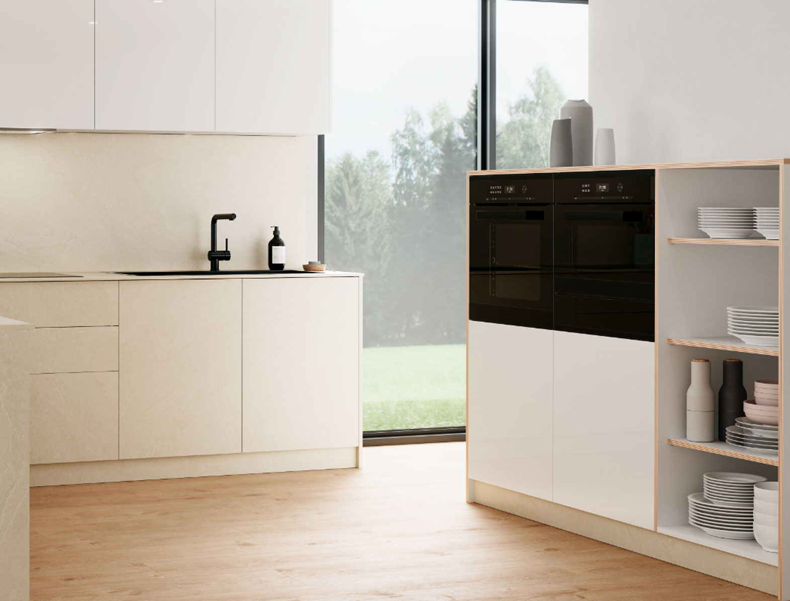 We continue with light shades ideal for kitchens: the textures of limestones. Here we show you the fronts made in Creta Marfil Teide, from the Duo Range, and the countertop of Creta Marfil Moa Fintop+. Notice the soft veins accentuated by the off-white, specially designed to create warm and luminous environments.
