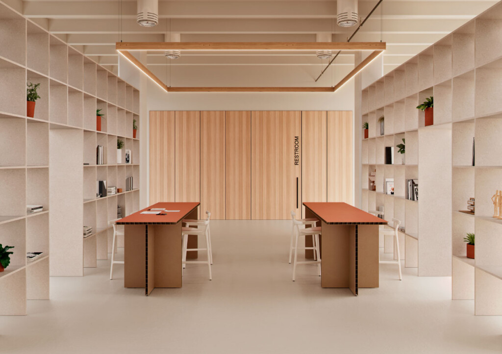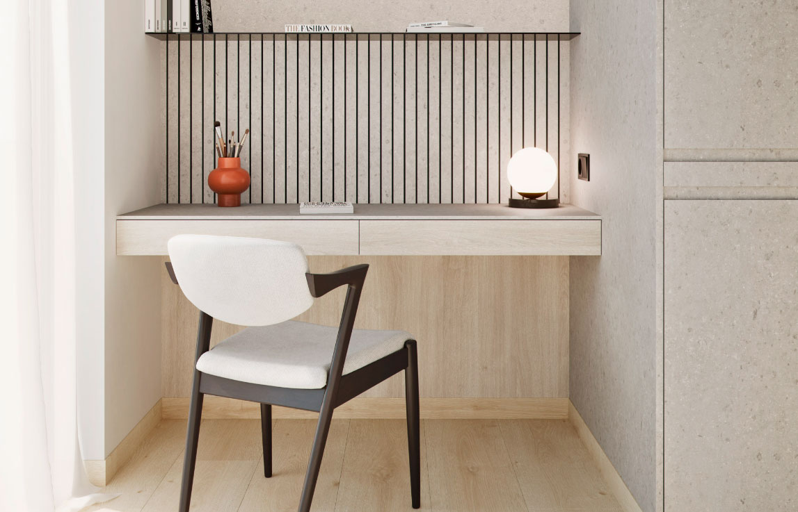Another arrangement of micro-stones is in the way Gravity Niebla Moa creates a home office corner, visually delineating different environments.