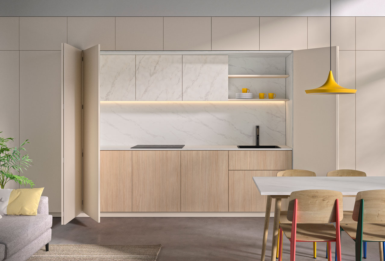 In this image, the smooth touch of Mármol Blanco Balm Fintop+ on countertops perfectly matches the table top and fronts of Mármol Blanco Teide.