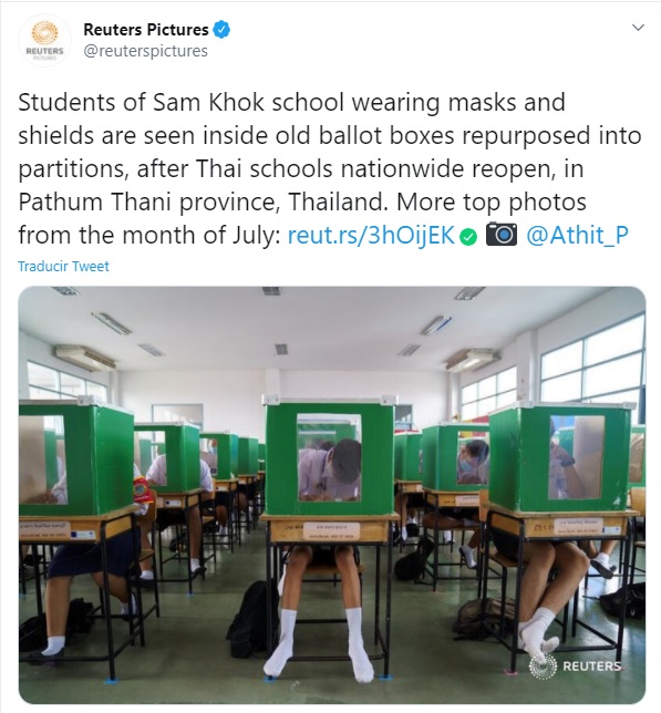 En Thaïlande, dans cette école de la province de Pathum Thani, chaque élève est isolé par un écran. De la classe bulle au bureau bulle.