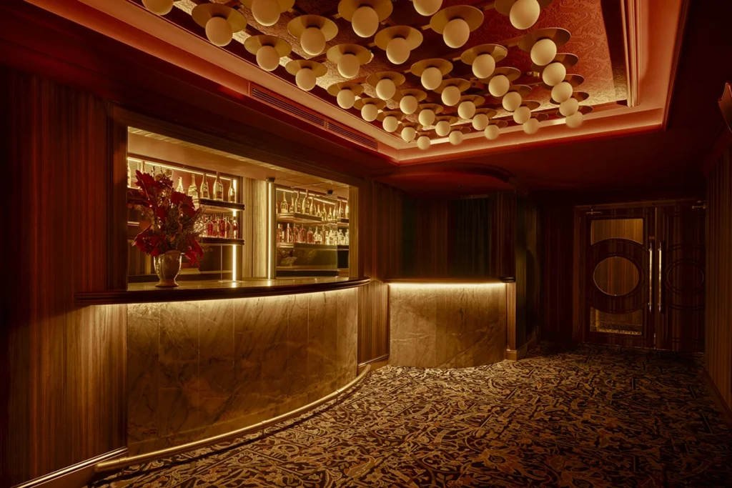 Techos con molduras, elementos escultóricos, terciopelo y moqueta… Blondie Club Madrid es un espacio de “lujo desenfadado”, con cierto toque nostálgico y mucha elegancia. Todo esto se logra a través de los materiales, las texturas y los detalles, que refuerzan el carácter ecléctico y sofisticado del proyecto. “Los brillos metálicos, presentes en molduras y mobiliario, de dorado y latón, evocan la estética mid-century de alta gama que recorre el local”, señalan.