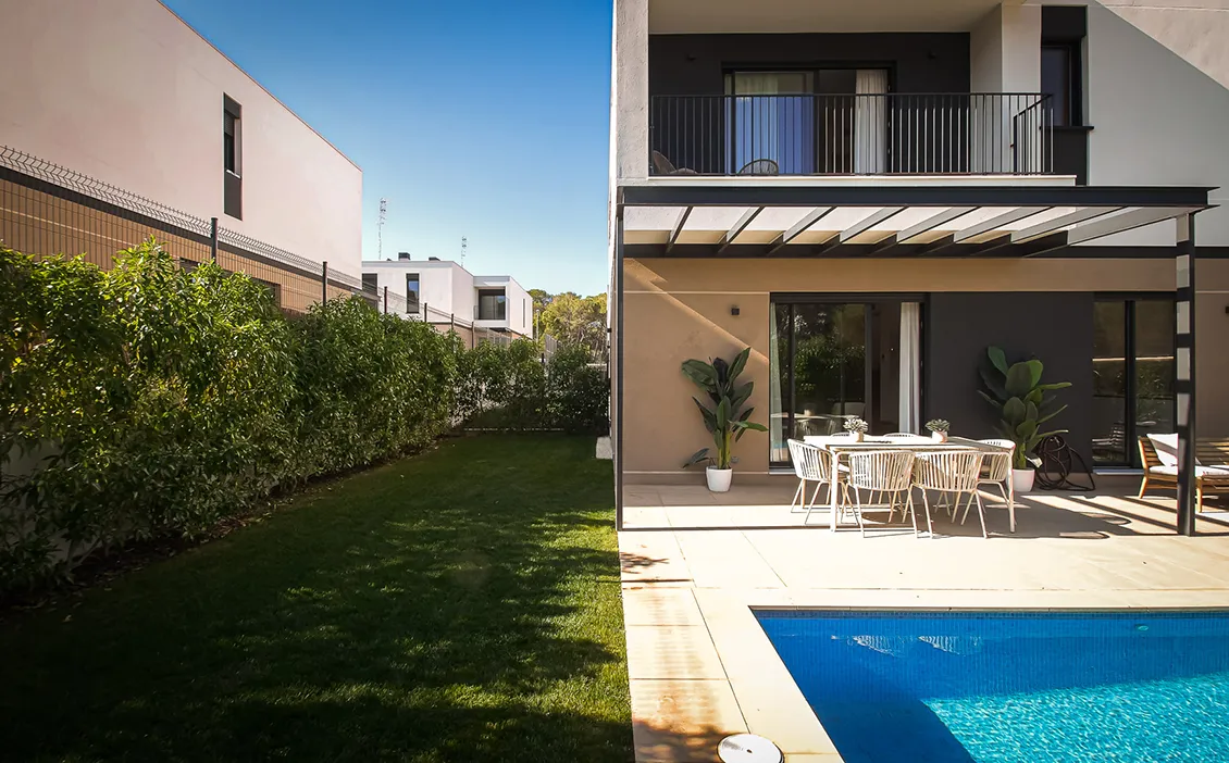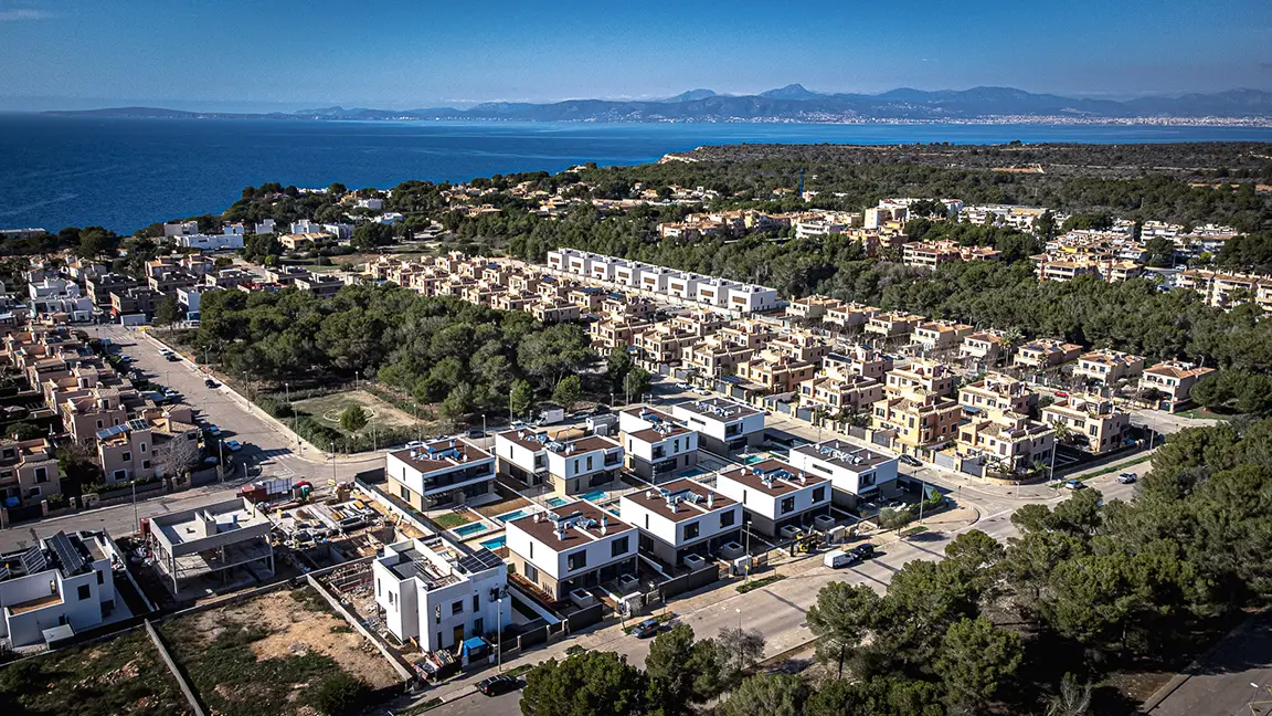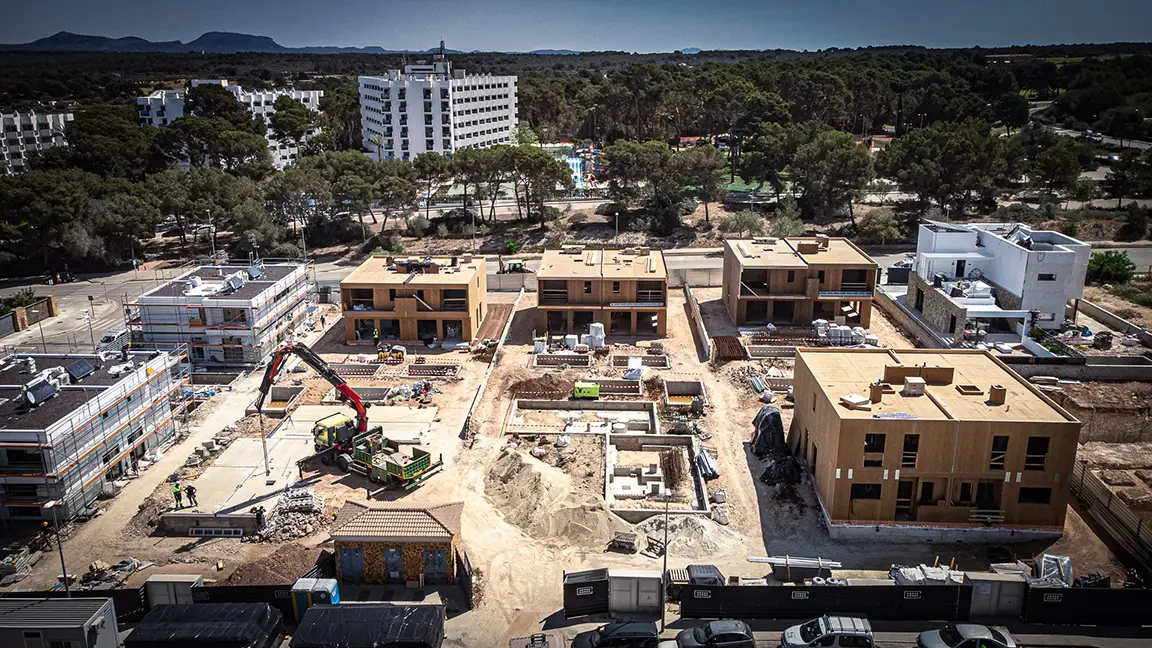 Llucmajor es uno de los pueblos con más encanto de Mallorca, famoso por su artesanía de cuero y situado a solo veinte minutos de Palma y cerca de zonas costeras de aguas cristalinas como Cala Vella o Cala Maioris. En este enclave tan característico se ubica el caso de estudio que queremos presentarte por ser un modelo de construcción industrializada: la promoción Eneida de AEDAS Homes, que consta de 16 chalets unifamiliares y pareados de cuatro dormitorios, cada uno con piscina y jardín privados.