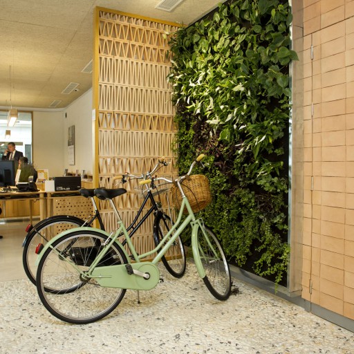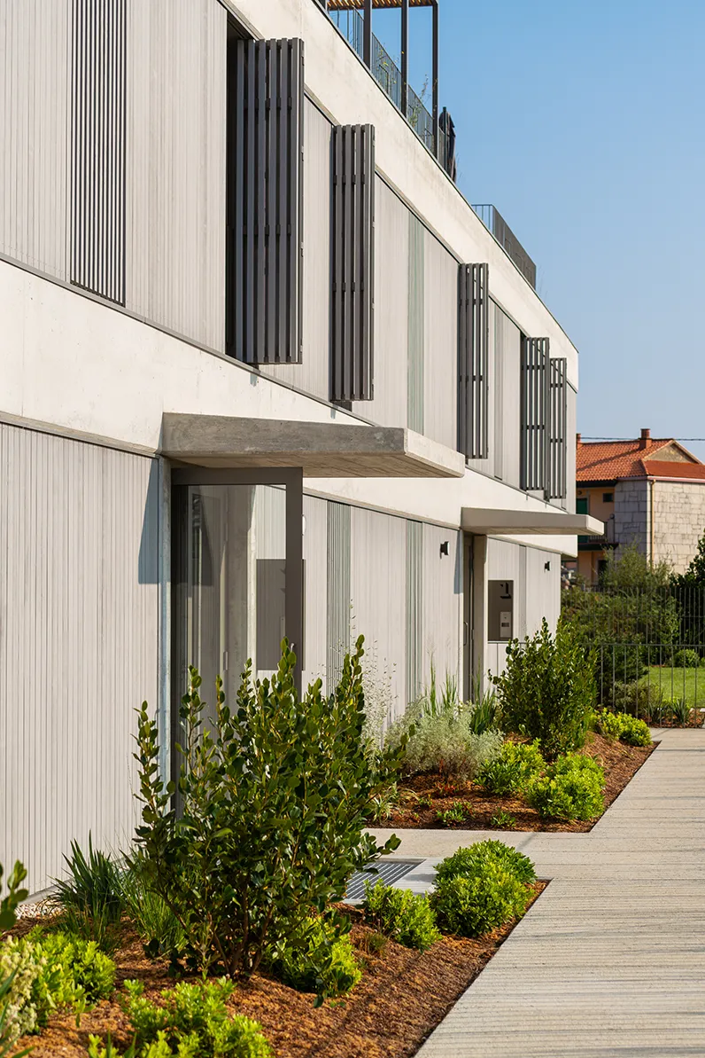 “Lo primero que se decidió fue utilizar especies y vegetación preexistente en esta zona costera, implementando todo de forma racional y armoniosa con los edificios, dedicando un elevado porcentaje de los espacios a senderos y zonas verdes”. De esta forma, incide Carbajo, “pese a la fuerte antropización del área, el verde es lo que predomina”. Las cubiertas vegetales de la promoción ordenan los edificios y los protegen a nivel acústico y térmico, funcionando además como canalizadoras del agua de la lluvia que se reutiliza.