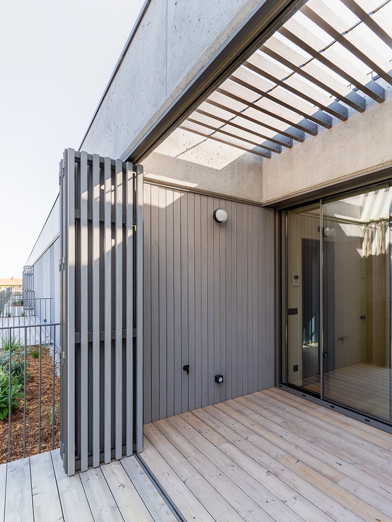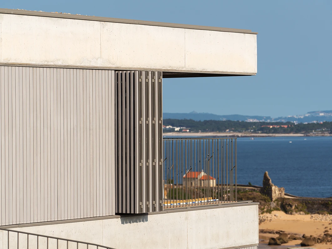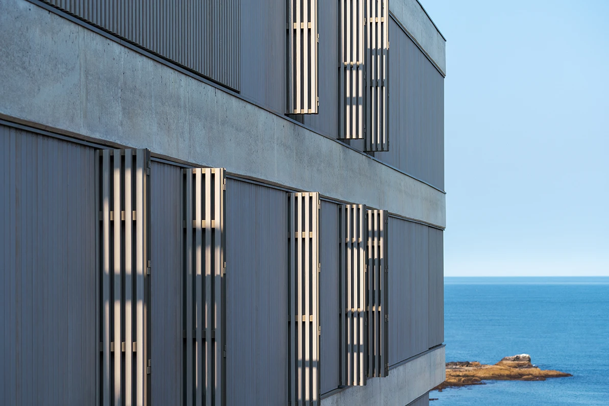 Las viviendas, con un máximo de dos alturas y establecidas en cuatro parcelas, mantienen su propia identidad dentro de esta armonización. Algunas se vinculan directamente al mar desde una terraza en la que casi se pueden mojar los pies, mientras que otras mantienen relación con las montañas circundantes. La madera termotratada abraza la fachada “y recoge el carácter de costa y de elemento natural”, resalta Carbajo. El contraste entre la rotundidad del hormigón y la tersura y transformación natural de la madera, “con ese color grisáceo tan característico, fue el juego de materiales que necesitábamos”, estima el arquitecto.