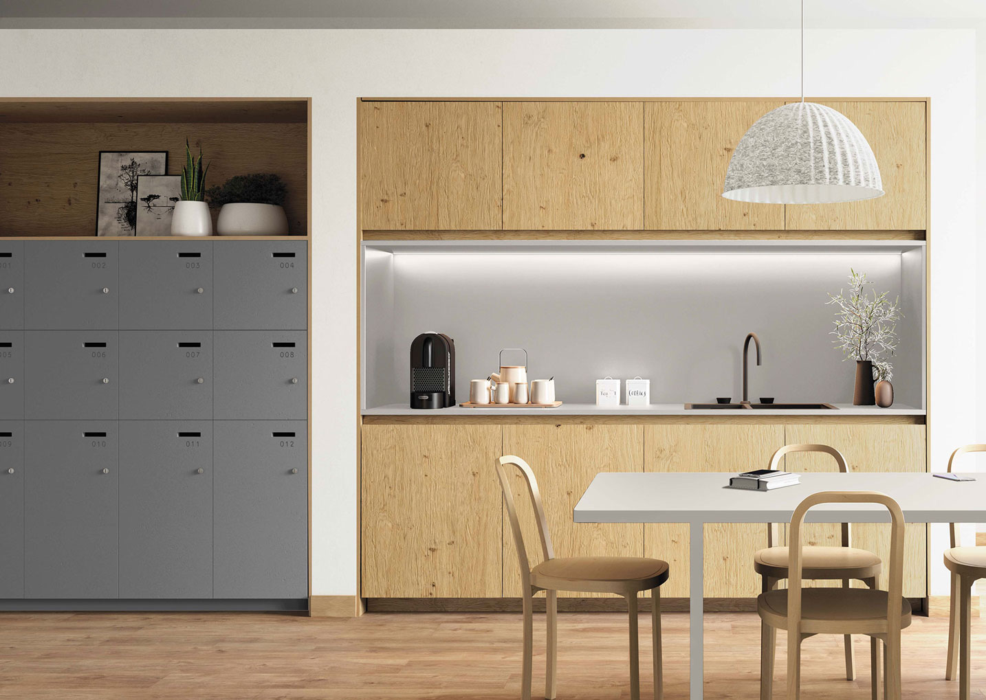Los bloques de Fibrapan E-Z Tex Blocks añaden un equilibrio vanguardista de sombras y relieve que enriquece la estética del ambiente, ofreciendo un contrapunto a las líneas limpias y la paleta de colores suaves.