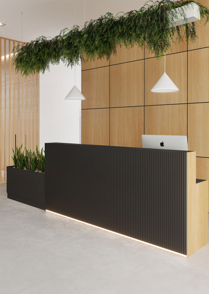 En esta nueva aplicación de texturizado en mostrador tenemos la elegancia y modernidad de Fibracolour E-Z Tex Negro Pirámide. Genera un interés sutil pero impactante al tiempo que crea profundidad. Aprecia el contraste con el acabado liso y natural de la madera en la parte superior.