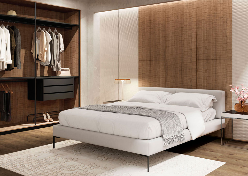 Fíjate en este cabecero hecho con el tablero de chapa natural texturizada Fibranatur EZ Tex Nogal Fuji. Aporta una calidez natural y profundidad al diseño de la habitación, creando un punto focal elegante que complementa los tonos neutros y la decoración minimalista del espacio. Además, su gran tamaño actúa como un elemento unificador, que armoniza los distintos componentes y realza la sensación de amplitud y confort.