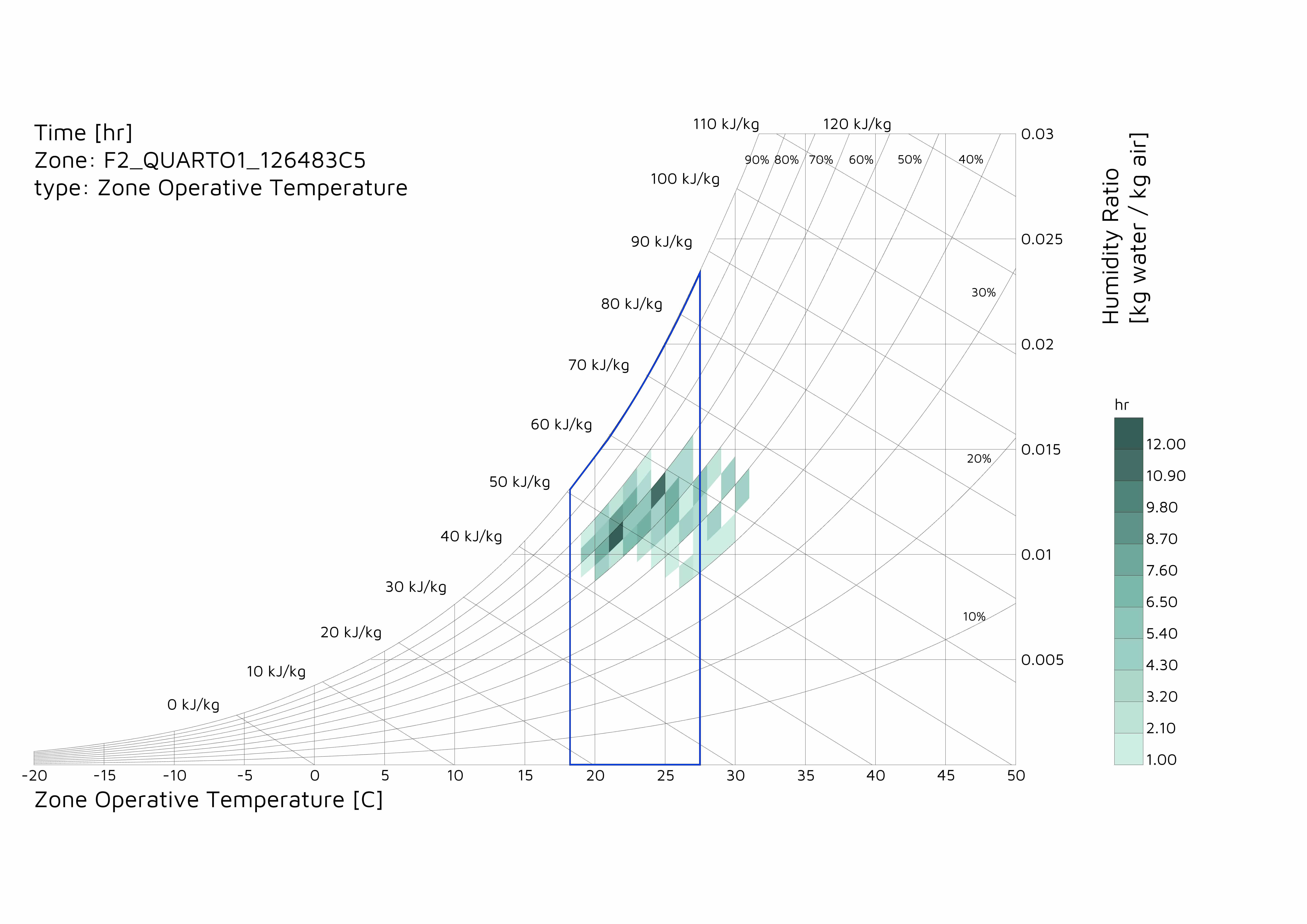 Le studio RDR Architects à Lausanne (Suisse) la demandé à Dosta Tec de réaliser une étude de confort thermique d’un ensemble immobilier en tenant compte du climat actuel et de la projection du climat futur, en garantissant toujours la plus haute qualité de logement. Pour cela, ils ont utilisé, entre autres outils, un psychrometric chart (un graphique psychrométrique, qui présente les propriétés physiques et thermiques de l’air humide) pour une pièce exposée au sud.