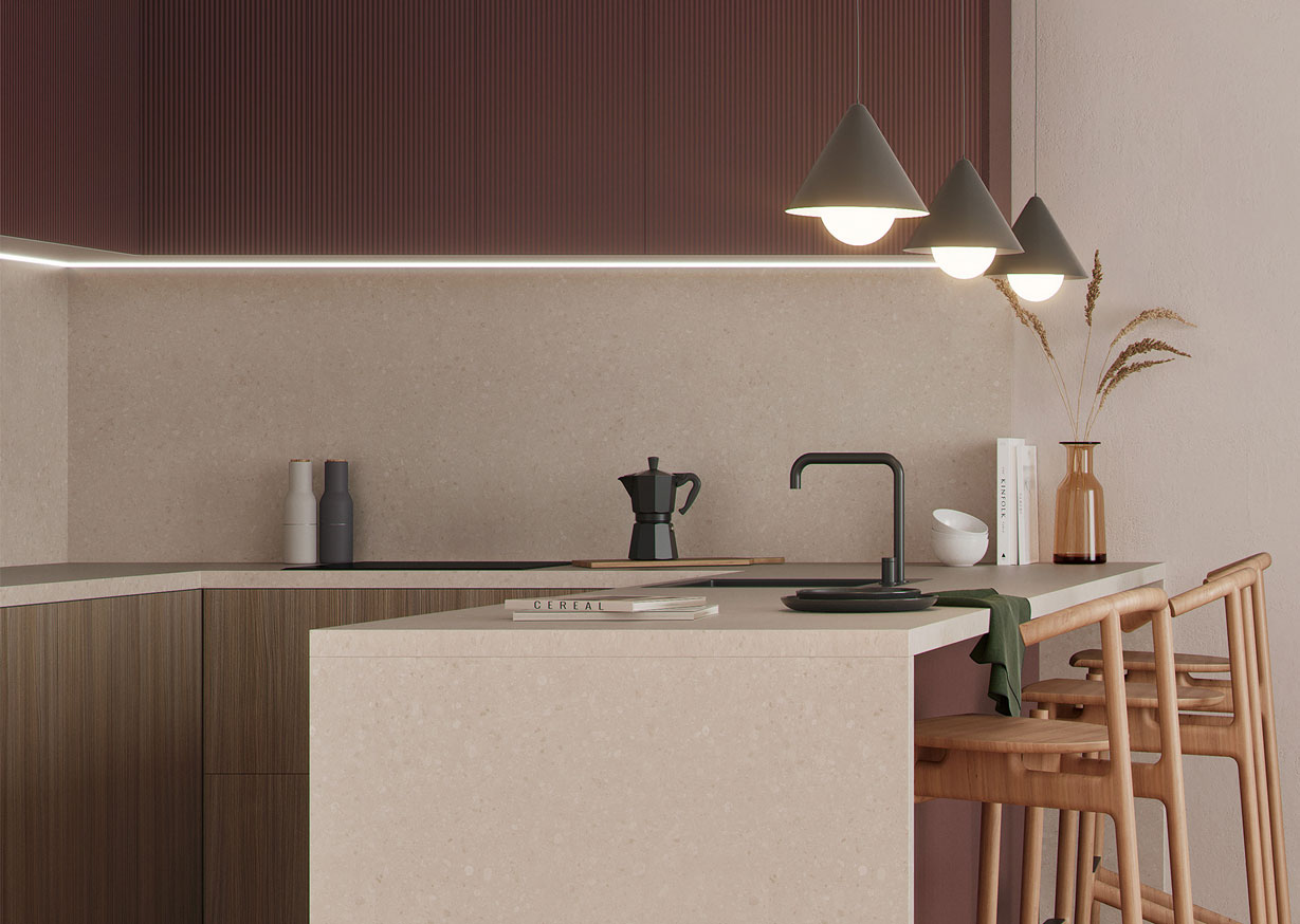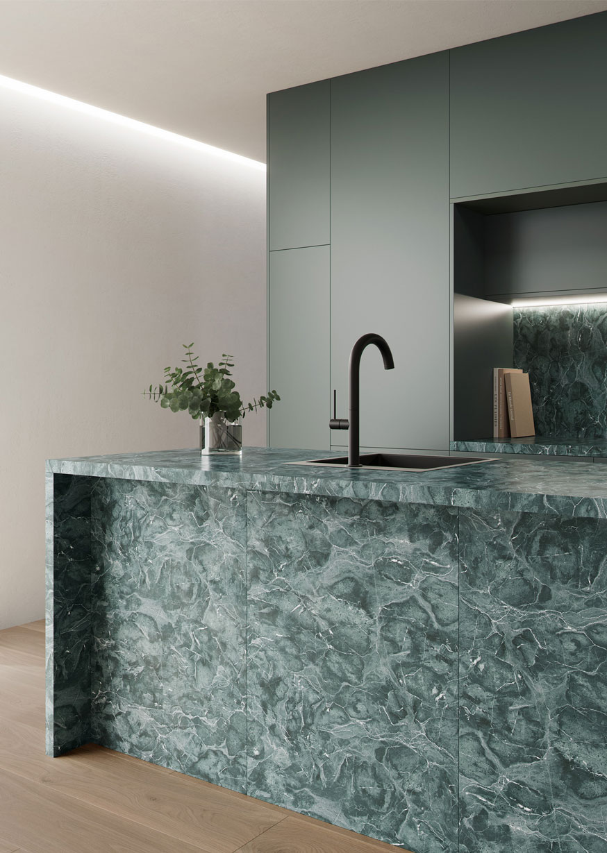 Se acabaron las elecciones limitadas en colores. El rosa y el verde, especialmente, están siendo tonalidades de referencia por evocar la naturaleza y transmitir calma y elegancia. ¿Quieres ver un ejemplo? Fíjate en esta superficie de mármol clásico con tonos verdosos de distinta intensidad. El mármol, un clásico en cocina, busca innovar aplicando color, ya sea coloreando su base o sus vetas. Si además lo combinas con una textura ultramate y antihuella, como la gama Technical Matt, obtendrás un total look que nunca falla. Y, como ves, puedes aplicarlo tanto en superficies horizontales como verticales.