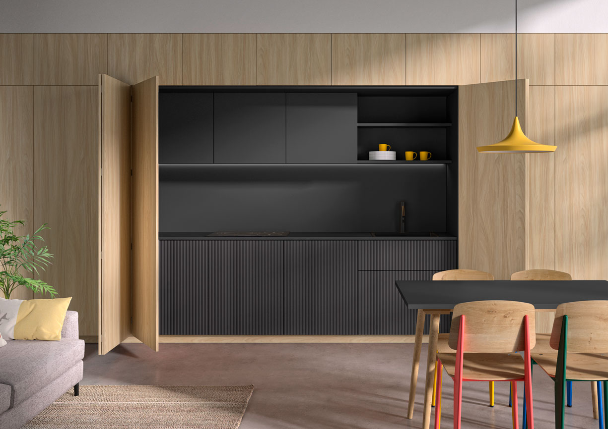 Te lo adelantábamos en este post: 2024 también es el momento de las texturas. Veremos muchas superficies acanaladas como este Fibracolour negro texturizado en armonioso contraste con otros materiales naturales, para brindarles la tactilidad que necesita un lugar como la cocina, donde vivimos el espacio a través de las manos.