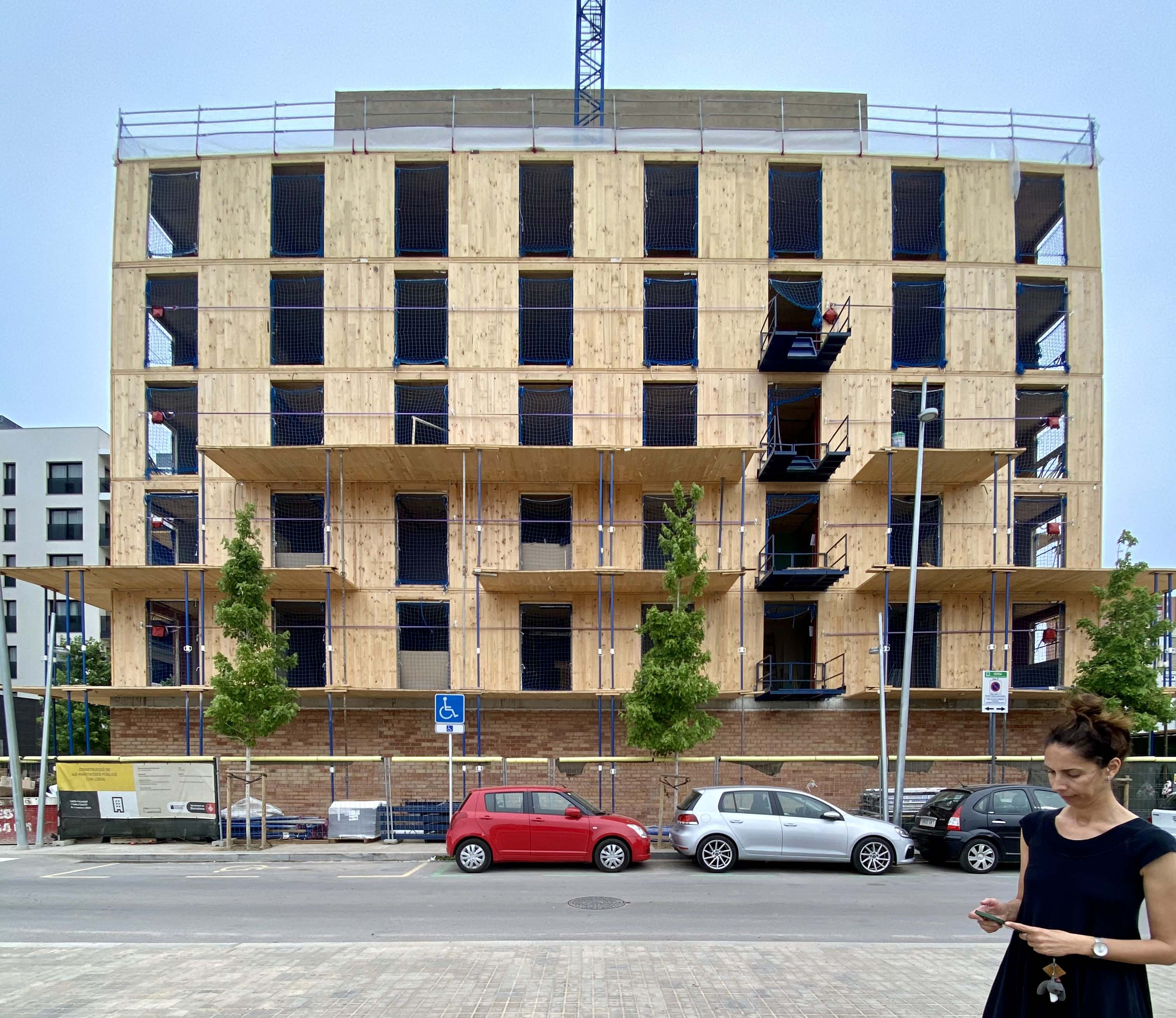 Ibáñez nos acompaña en este caso de estudio en el que analizamos la aplicación de CLT en el edificio más alto de vivienda social realizado en España con madera estructural. Este proyecto de cuarenta viviendas sociales resulta novedoso por este y otros factores. Desde el su propio proceso de licitación, el concurso cambió los criterios de evaluación tradicionales, en los que se valoraban a partes iguales las características arquitectónicas y el ahorro económico, por la introducción de las variables de emisiones embebidas con estructura y fachada, así como rapidez en construcción y ensamblaje.