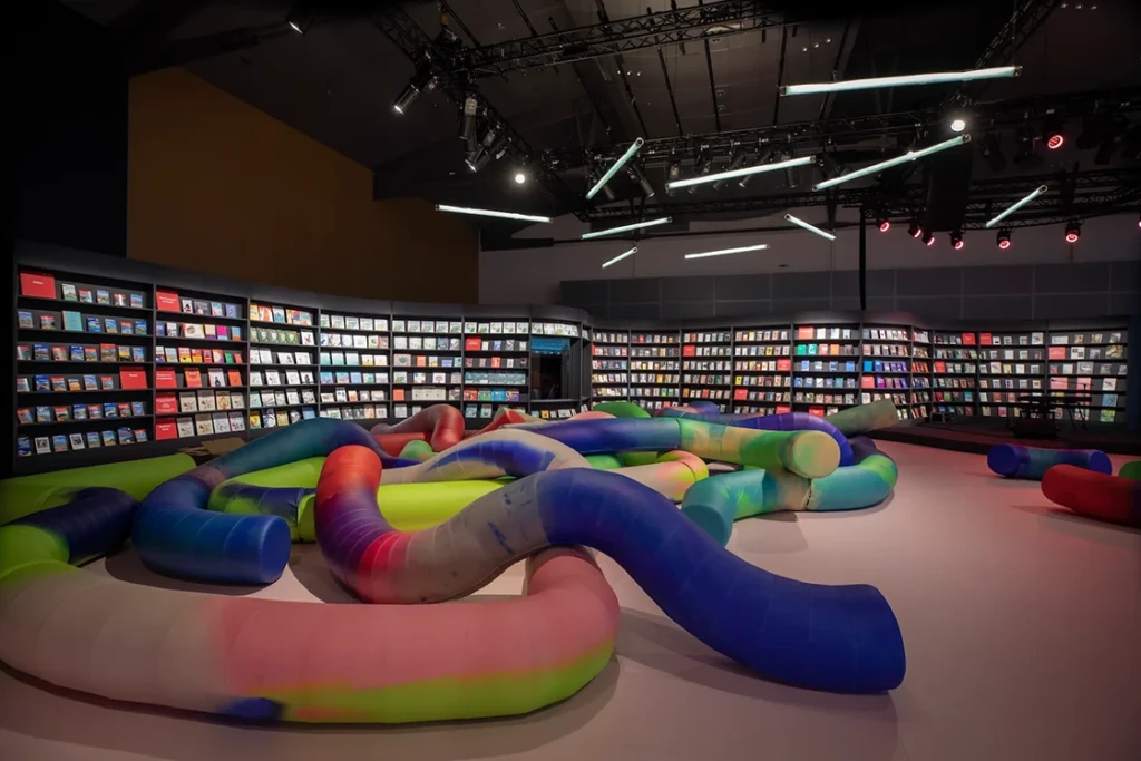 La reflexión sobre la desconexión no es nueva en el trabajo de Enorme Studio. En 2022, diseñó La Teoría de las Cerezas, el pabellón español en la Feria del Libro de Fráncfort, que incorporaba un sofá de 130 metros lineales. “Fue un exitazo, siempre estaba lleno de gente gracias a esa llamada a la lectura colectiva”.