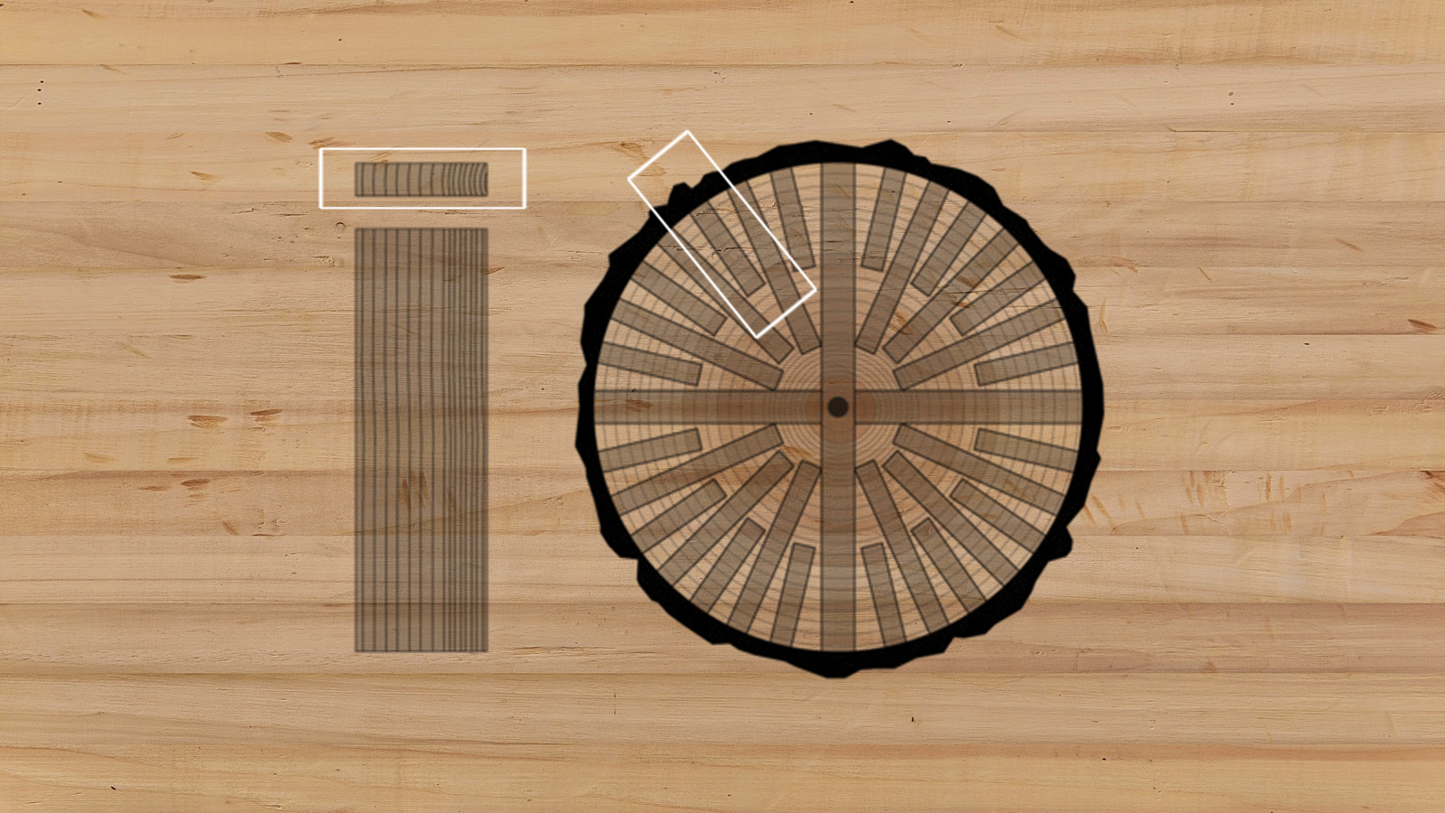 Pour parler de la forme, il faudrait revenir à ce qui précède, c’est-à-dire à la façon dont le bois est coupé, puisque c’est ce qui déterminera la morphologie. Par exemple, si la coupe était faite tangentiellement, elle aurait une forme ronde, et si elle était radiale, elle aurait une forme en chevron.