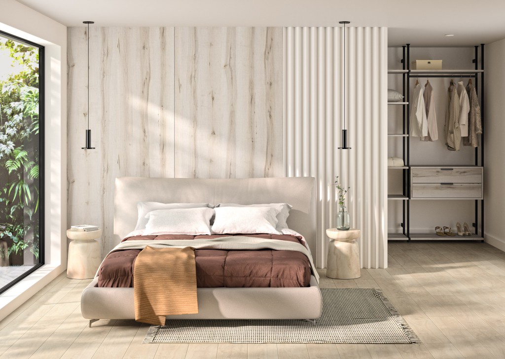 Dans ce projet, la lumière tamisée nous permet de voir des surfaces qui procurent calme et tranquillité, et aident à explorer une tactilité subtile en harmonie avec le reste des éléments de la chambre. Les couleurs claires, le bois veiné et irrégulier, les tables-tabourets en forme de souche d’arbre et les textiles naturels, épais et effilochés complètent l’ambiance brute.