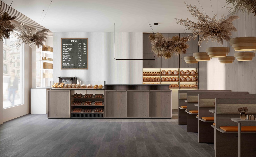 Des plateaux aux bords apparents et panneaux sculptés s’associent à des meubles simples, des lampes en fibres végétales et une gamme de couleurs beiges et terreuses pour donner forme à une boulangerie aux lignes pures et à l’ambiance organique et naturelle.