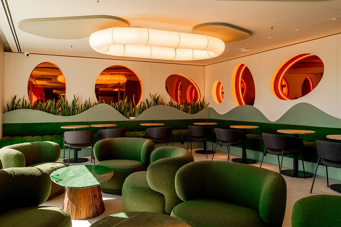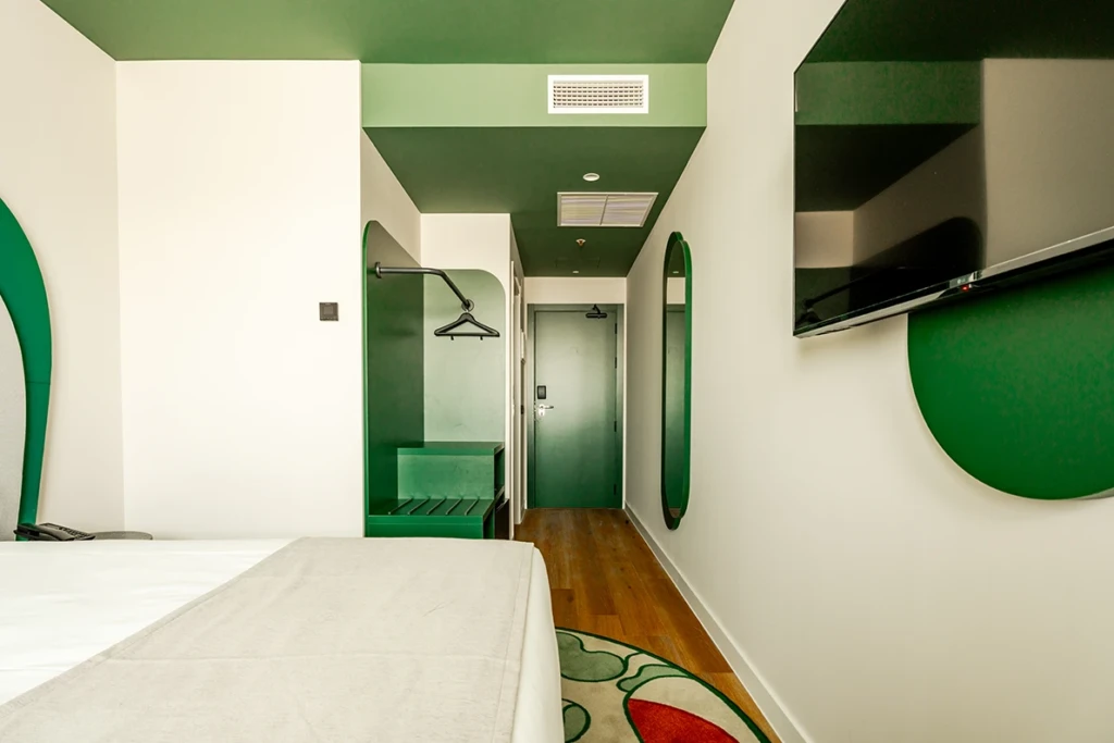 À Valdebebas, l’agence Dorotea Estudio a transformé un hôtel de grande taille en une séquence de vignettes chromatiques. L’identité est basée sur un colour blocking optimiste — verts et carreaux — qui organise les armoires, les miroirs et les meubles de télévision comme s’il s’agissait de pièces graphiques.