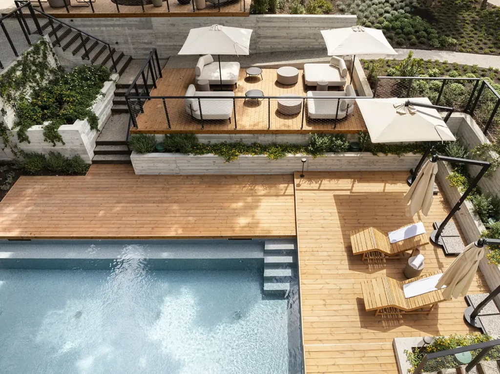 Nous aimons l’application du… Thermopine Savia sur la terrasse extérieure, combiné avec le système Gradpanel Thermopine sur les lames en façade, pour un contrôle solaire chaleureux et efficace.