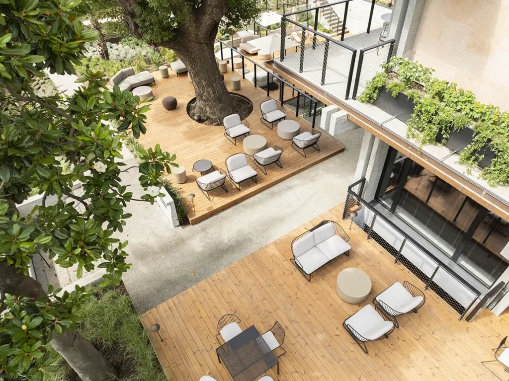 « Un parc avec un hôtel », telle est la définition des auteurs, et ce renversement de priorités se ressent dans la façon dont chaque chambre est tournée vers l’extérieur, profitant du climat tempéré de la Riviera.