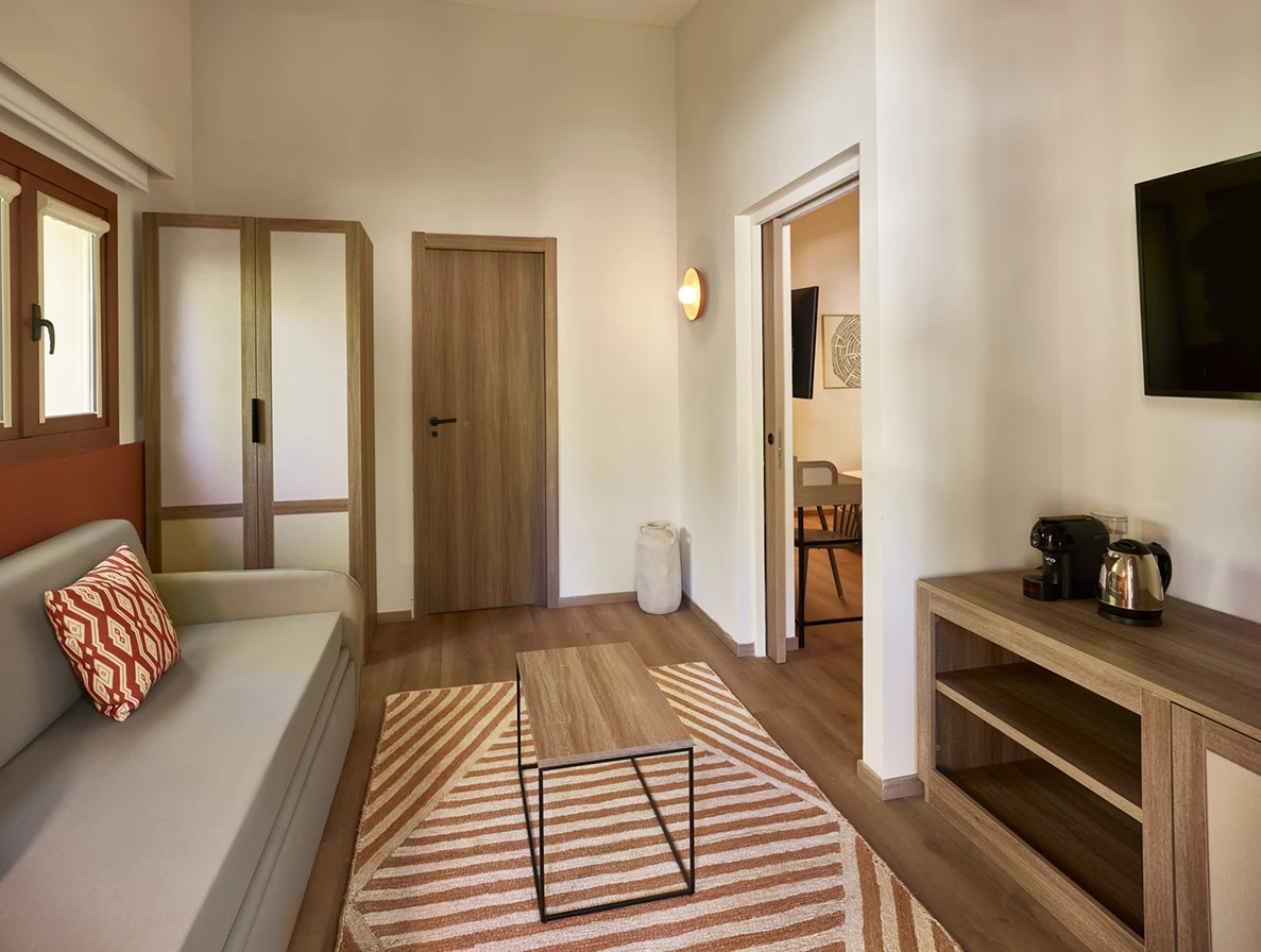 Les suites, conçues pour les longs séjours, étoffent le look résidentiel générique et embrassent un luxe méditerranéen tranquille obtenu avec un univers de bois clairs, des façades en décor tissé et une palette de bleus minéraux qui rafraîchissent la lumière de Malaga.