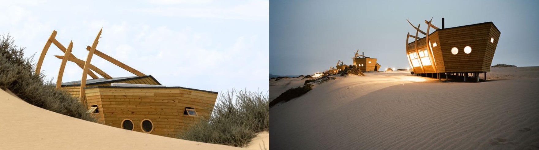 Son 12 cabañas que tienen forma de barco, con el objetivo de hacer un homenaje a todas esas embarcaciones que terminaron yéndose a pique en la zona por culpa de las densas nieblas oceánicas que se producen durante todo el año.