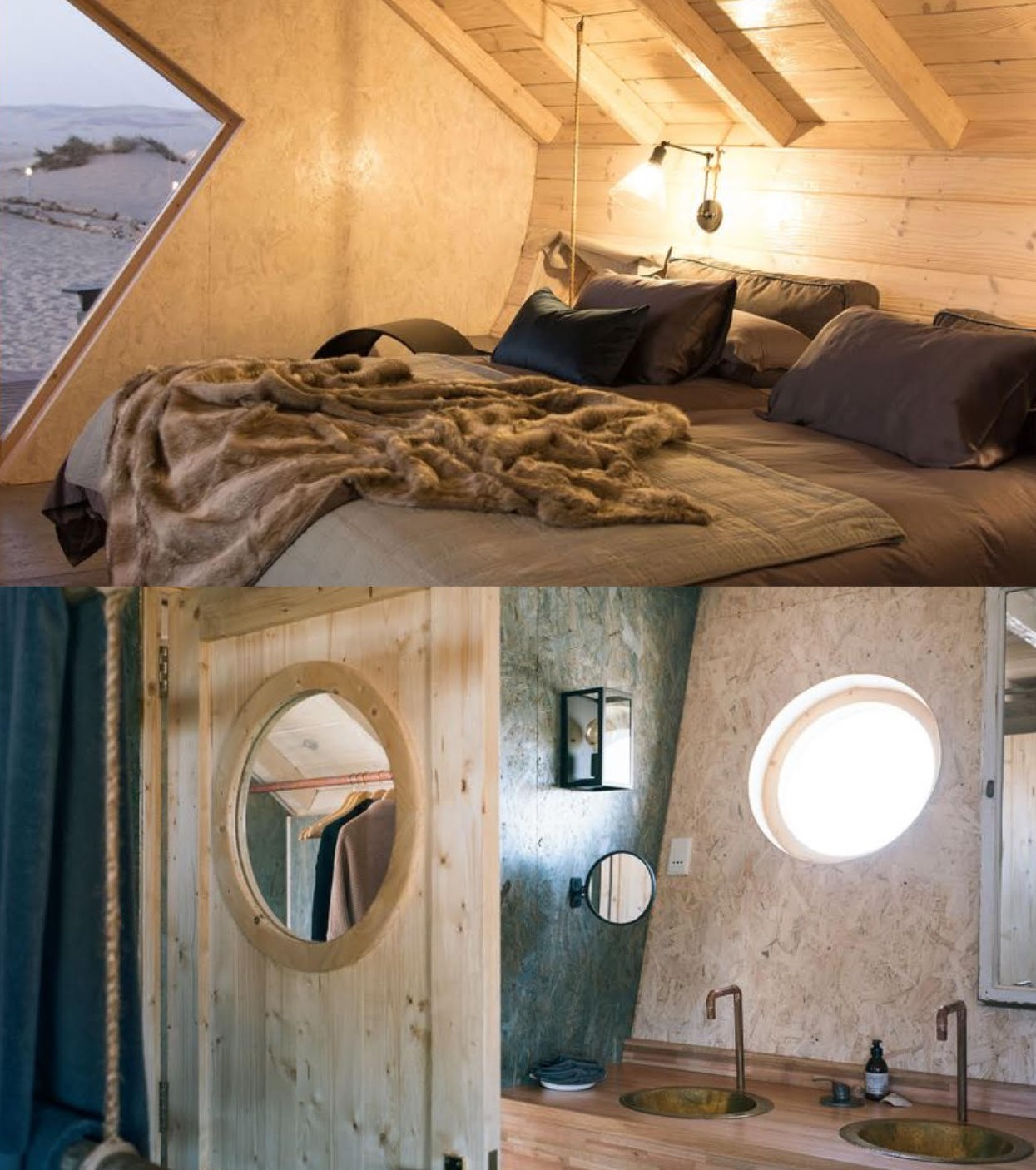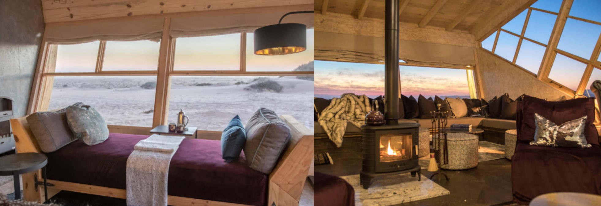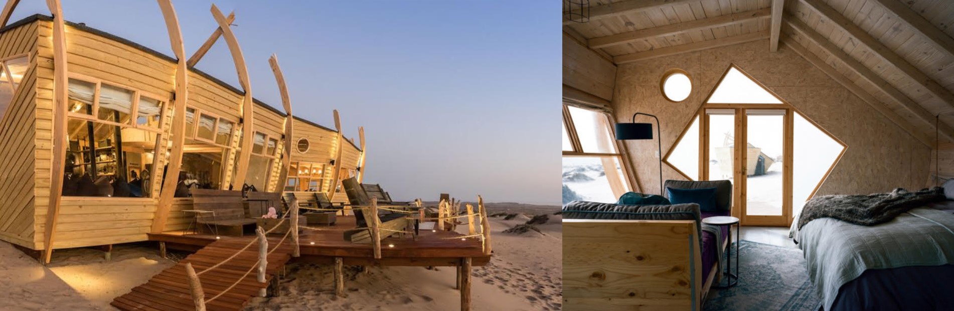 Las cabañas se han hecho en madera y se abastecen con energía solar. Pese a que el desierto ocupa la región, lo cierto es que el establecimiento se encuentra a corta distancia del Océano Atlántico.