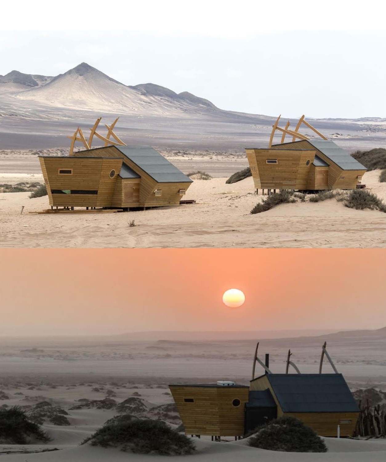 Nina Maritz Architects, con sede en Windhoek, capital de Namibia, encontró la inspiración en los cientos de naufragios esparcidos por la Costa de los Esqueletos para diseñar estas cabañas de lujo, en pleno hogar de elefantes, leones, hienas y otros animales salvajes adaptados al desierto.