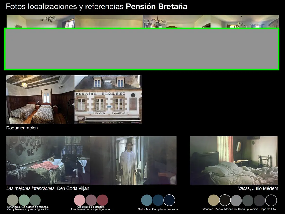El trabajo comienza en la preproducción con el análisis de guion y la creación de moodboards. “El cine se nutre de distintas artes. La primera chispa se enciende con el propio guion y luego lo que puedes aportar de tu bagaje cultural”, dice Robles Castrillo.