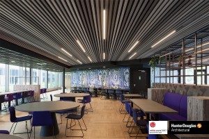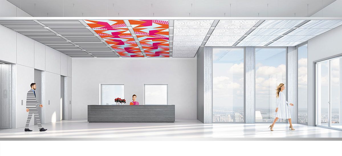 Un autre moyen d’améliorer l’acoustique et de décorer est le système Neonny Hexagon, un produit polyvalent qui fusionne le plafond acoustique et la toute dernière technologie d’éclairage à LED.