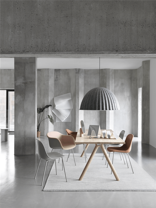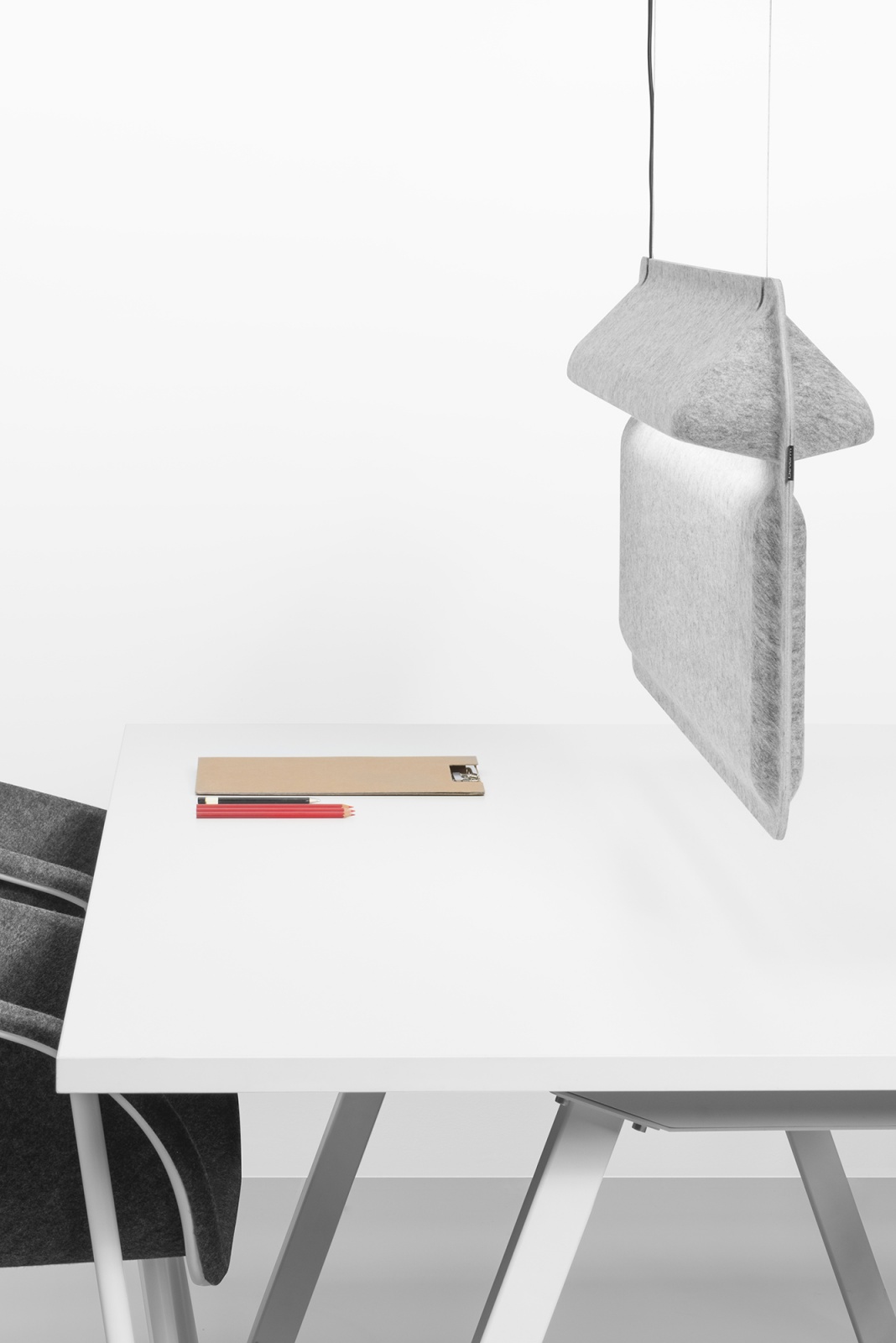 Aucun espace ne peut se passer d’éclairage. Alors, pourquoi ne pas combiner les deux fonctions ? Le Nordic Muuto a créé une lampe suspendue en feutre à partir de plastique recyclé et en forme de cloche absorbant le bruit.