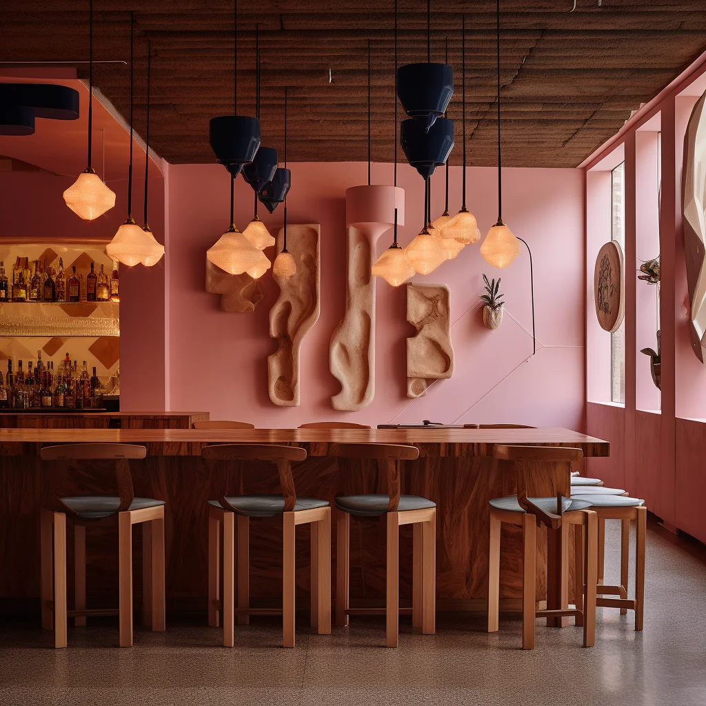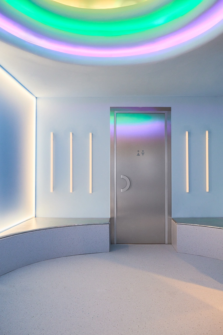 El diseño se basa en el arte cinético y busca reflejar una ilusión óptica que inspire curiosidad por lo que se va a disfrutar. La zona de espera de la entrada simula una nave que realizará el viaje de los sentidos, donde se guía con un tono azul hielo hacia el interior minimalista. Allí, una gran cúpula situada en el techo sirve para alojar el proyector que juega con las luces en función del ritmo del servicio.