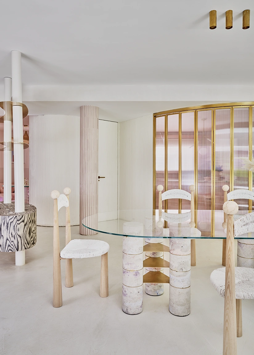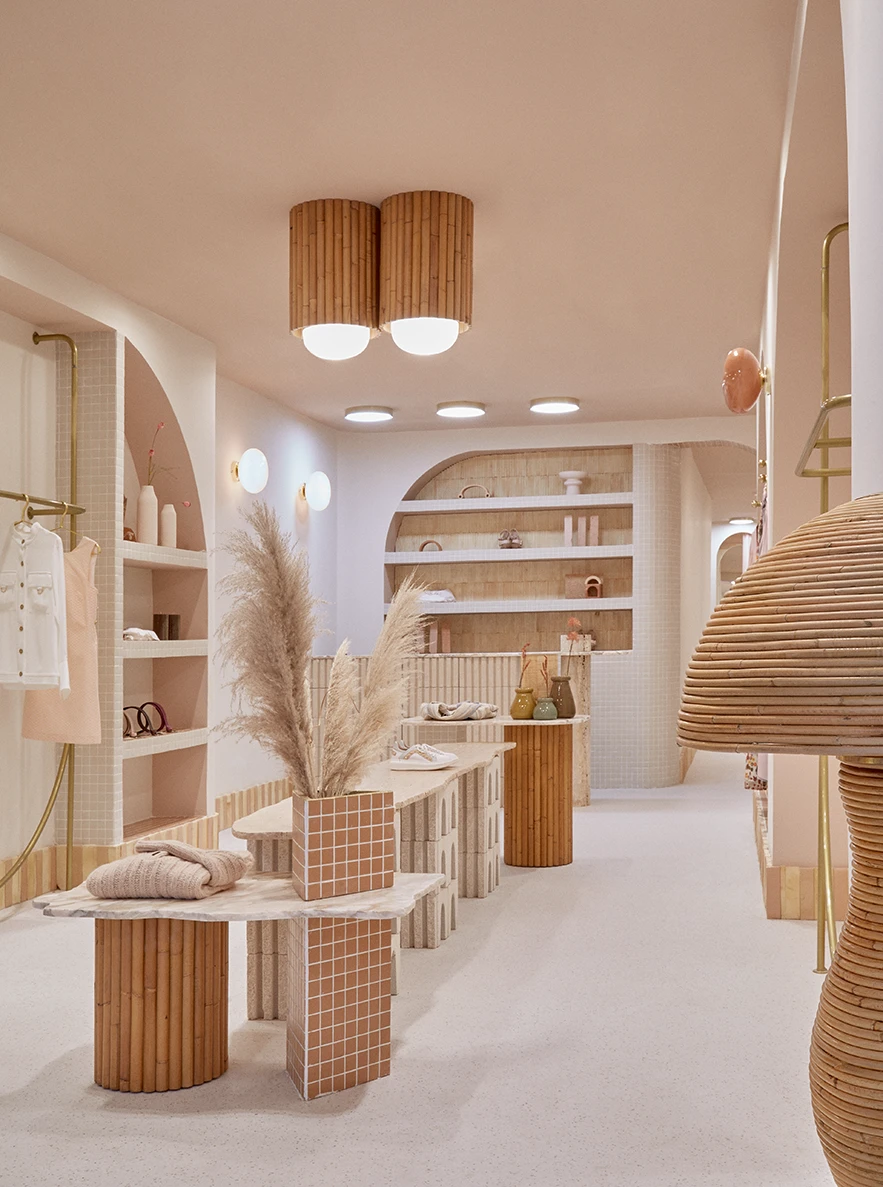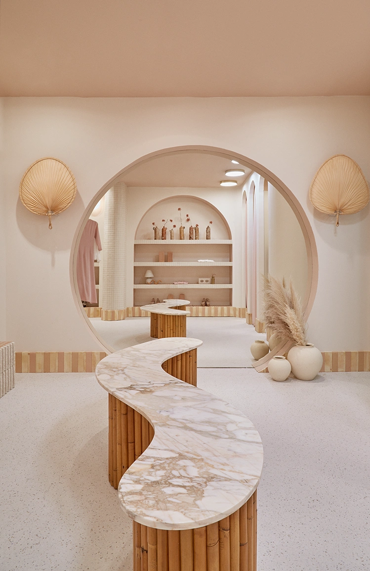 Las personas que entran en el espacio se ven recogidas por un entorno armonioso de colores tierra y tonos cálidos donde se integra una sensación de belleza en bruto (conformada por una selecta combinación de mármoles y piezas de barro) mientras recorre los expositores donde se descubren las prendas de la marca. La arquitectura y la ropa dialogan entre sí, contándose una historia de herencia e innovación.