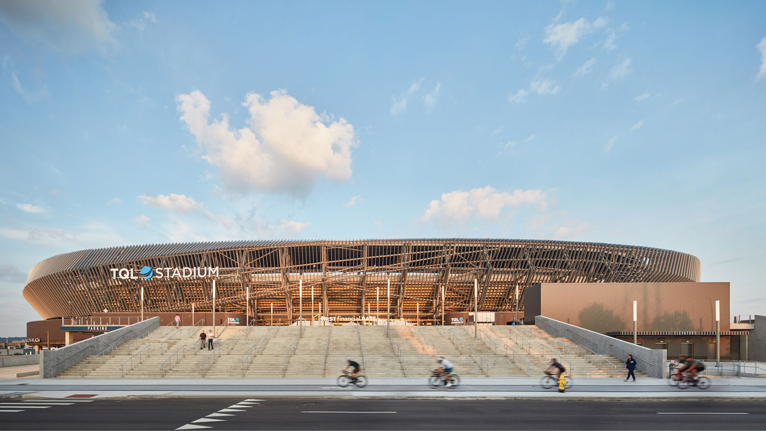 La MLS (Major League Soccer) aux États-Unis a trouvé son point de référence dans la ville de Cincinnati avec l’achèvement du TQL Stadium en 2021, d’une capacité de 26 000 personnes. Il dispose d’un design progressif, jamais vu dans des projets de ce genre, jouant avec 500 ailettes verticales sur sa façade qui sont connectées à un système LED unique créant des séquences en mouvement. Cette enveloppe, inspirée par l’énergie cinétique de la base de fans du club, reflète la tension entre les deux équipes qui disputent le match.