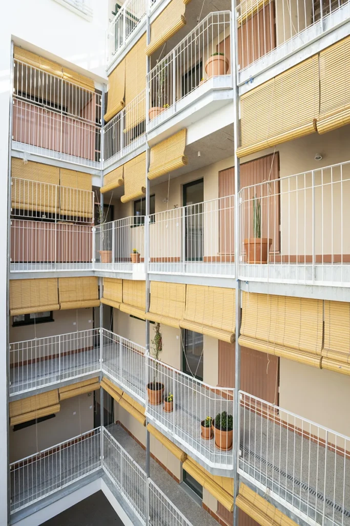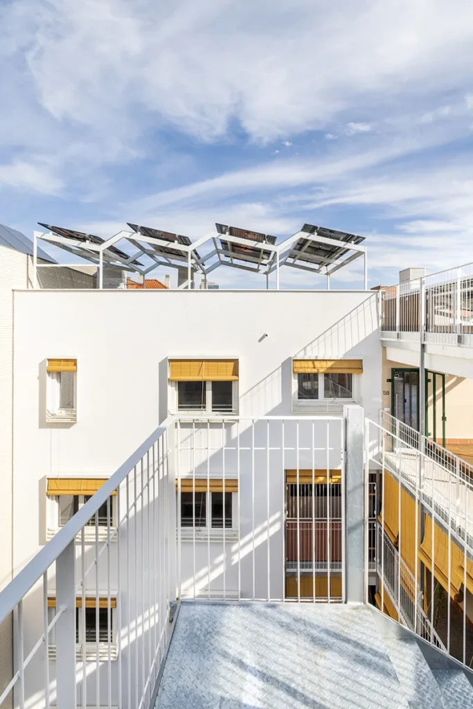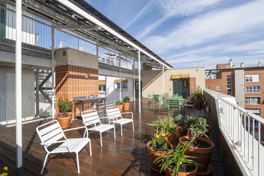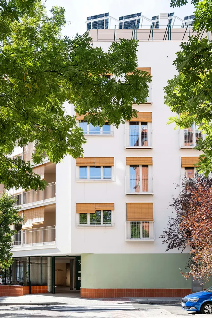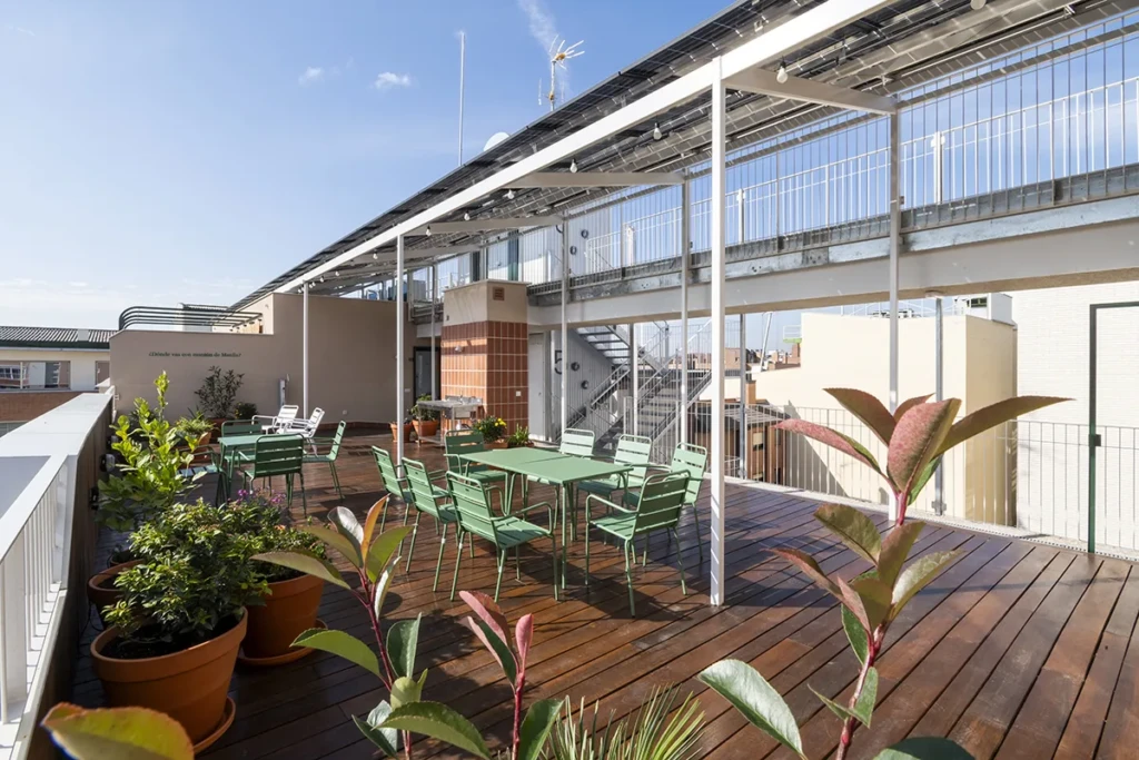 El edificio Tomás Bretón combina equilibrio social, ambiental y económico. En lo social, se basa en un modelo donde la comunidad es la columna vertebral. “Se ha trabajado con diseño participativo desde fases tempranas: personalización de viviendas, definición de zonas comunes, gobernanza y resolución de conflictos”, explican desde el estudio de arquitectura. El edificio cuenta con 105 m² de terraza compartida, salas polivalentes, patio, jardín, taller de bicicletas y un soportal común.
