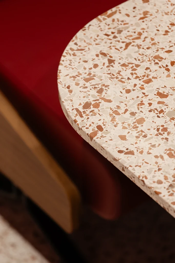 Además, el uso de terrazo en los suelos, las mesas y las encimeras sirve para darle al restaurante un toque más íntimo y doméstico. «Que sea un poco como estar en casa, en familia», asegura el arquitecto.