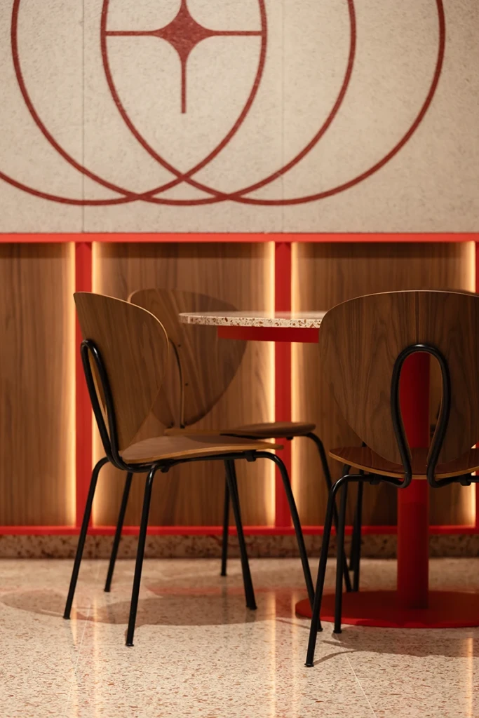 Trabajaron en vertical con materiales muy distintos: Heraklith, con una textura más rugosa e industrial, donde pintaron los motivos, y madera (el FibraPan® Nogal Canaletto Mesura de Finsa) para los zócalos. “Ese contraste entre lo industrial del Heraklith, que sí se ve en más hamburgueserías, y un material más elegante y noble como es el nogal le da ese toque algo más elevado, más íntimo”, describe. Esto, unido a una iluminación led integrada cálida que baña la madera y a la transición entre ambos materiales que se hizo con unos perfiles metálicos rojos, ofrece una experiencia más acogedora. “Desde fuera ya se intuye un espacio más cálido que te hace entrar más que en una hamburguesería normal, donde la luz te pega un fogonazo”, reflexiona.