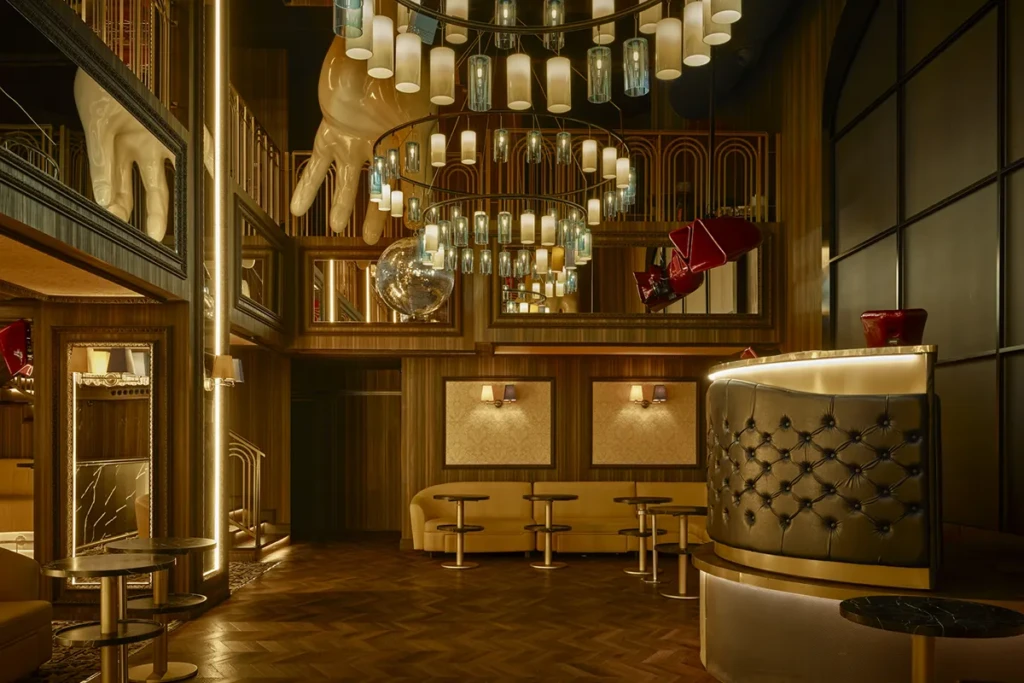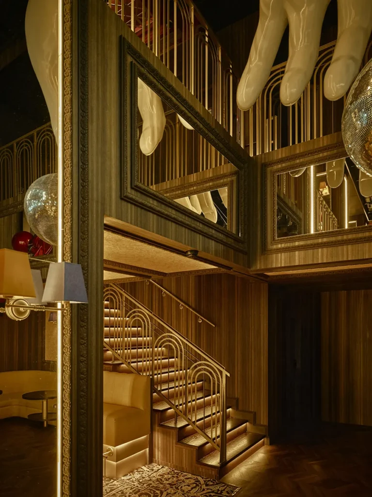 Para el Blondie Club, una discoteca y espacio de tardeo exclusivo en Madrid, en Ilmiodesign buscaron obtener el equilibrio de una modernidad nostálgica de forma muy sofisticada. “No es una copia de una discoteca de los setenta, sino una reinterpretación contemporánea con soluciones técnicas y formales actuales. Las bolas de discoteca nos reenvían a una época pasada, pero añadiendo unas manos que las sujetan proponemos algo más escultórico, irónico y surrealista que rompe con el pasado”, ejemplifican.