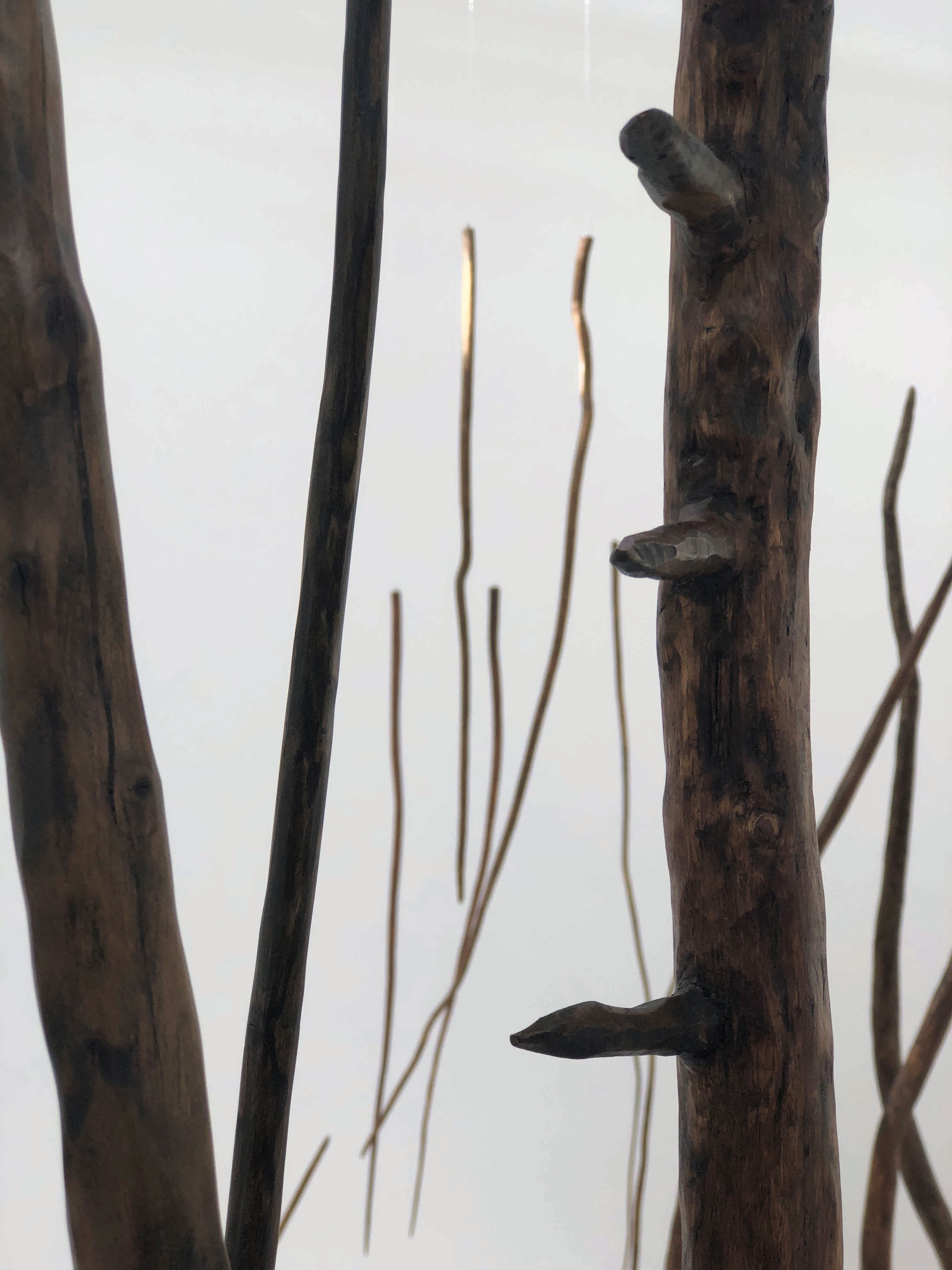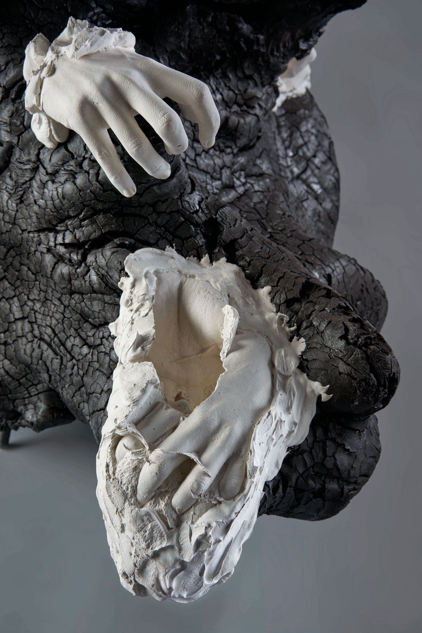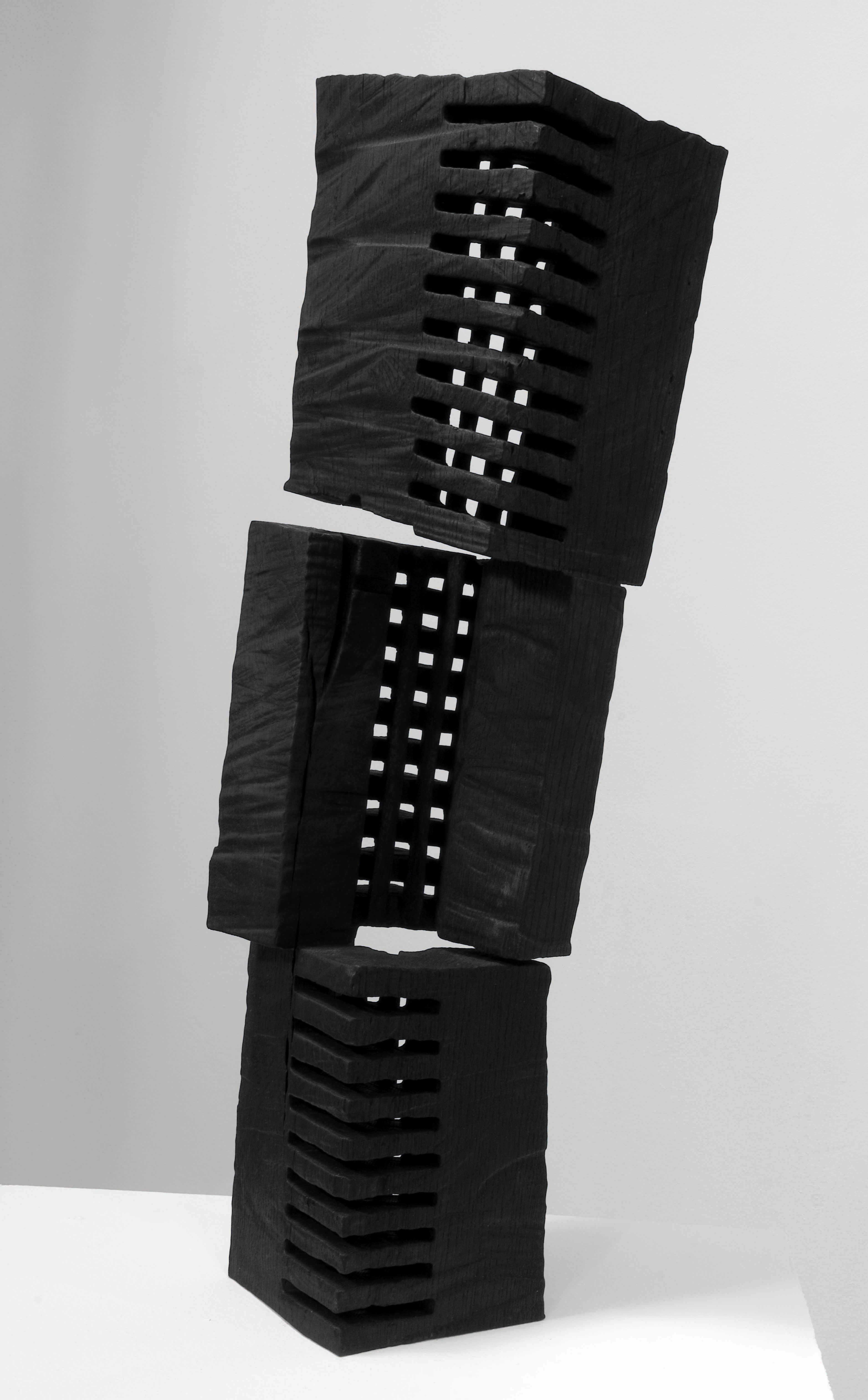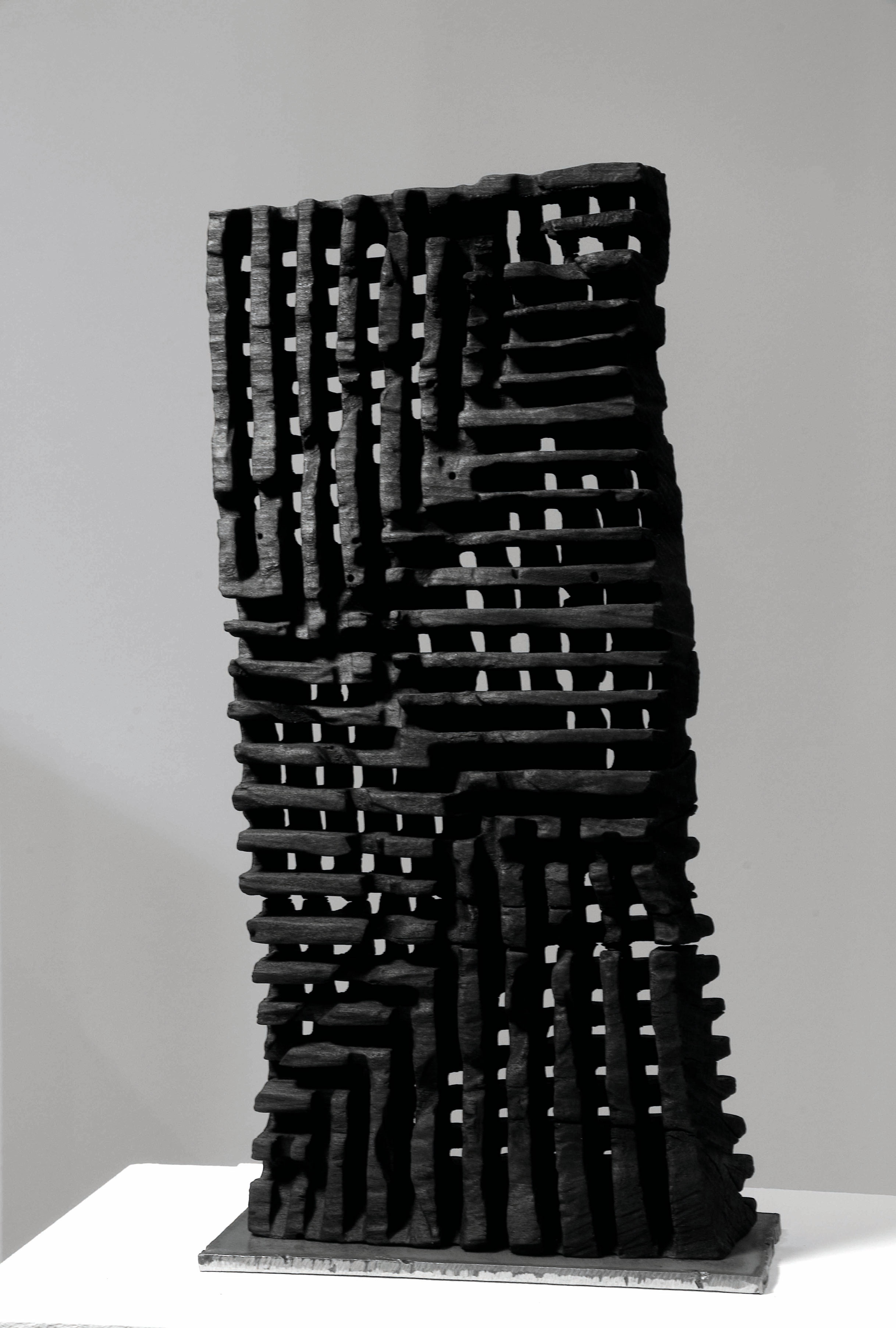 Les contrastes de Bastin et la précision avec laquelle il manie la tronçonneuse, son outil fétiche, sont présents dans cette œuvre. « J’utilise cette machine pour créer au lieu de détruire. C’est certes un défi technique, mais j’aime particulièrement le paradoxe d’utiliser une machine brute pour réaliser des formes fines et filigranes. Peut-être serait-il trop facile et moins intéressant d’utiliser une technique plus traditionnelle. Les traces que la tronçonneuse laisse dans le bois sont très importantes pour mon travail. Ces rainures, sillons et lignes sont comme un dessin, un dessin qui témoigne de la genèse de la sculpture », explique-t-il. Transparent Black est une œuvre géométrique à base de cubes et de rectangles où il joue sur l’opposition entre le plein et le vide, les trous fins (transparents) et la couleur noire du bois carbonisé, issu des bûches qu’il récupère près de chez lui. « Les bûches de mon atelier sont comme des personnages individuels que j’apprends à connaître. Elles ont toutes une histoire concrète, certaines ont plus de deux cents ans. Engager un dialogue avec elles demande un certain respect et une capacité d’écoute », explique Bastin à propos de sa volonté de révéler les secrets de la nature de l’arbre.
