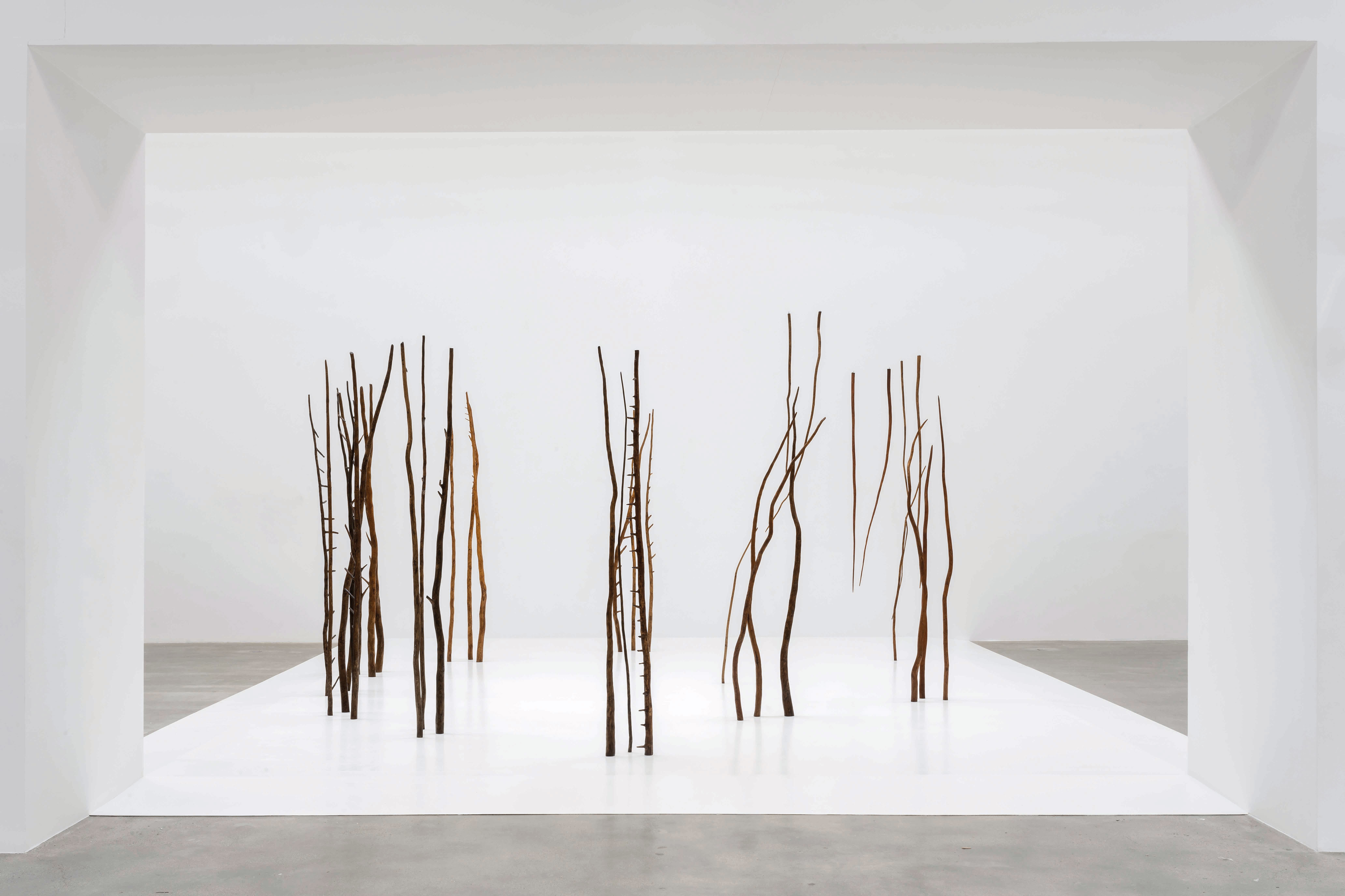 C’est dans le Colorado que Rosemarie Castoro, couteau à la main, a commencé à tailler des branches. Cette pièce de l’artiste polyédrique, réalisée avec un mélange de différents bois sculptés, relie la danse à une forêt abstraite avec une manière particulière d’interpréter l’espace. « Je veux la sculpter », écrit-elle dans ses journaux. Forest of Threes est une œuvre minimaliste et surréaliste (en 2020 elle a été présentée à la galerie Thaddaeus Ropac à Paris dans le cadre d’une exposition de 14 femmes pionnières en Europe et en Amérique qui ont contribué à élargir l’esthétique de l’art minimaliste) et également allégorique. « La famille de Rosemarie est italienne. Apparemment, son père parlait avec un fort accent italien et lorsqu’il prononçait le mot « arbre » (« tree » en anglais), cela ressemblait au nombre « trois » (« three »). C’est ainsi que le titre de l’ouvrage est né. Bien sûr, il y a aussi trois branches d’arbre utilisées pour créer un t(h)ree, explique son mari, Werner Pichler. Castoro l’a, elle, exprimé ainsi : « Une chorégraphie de flexibilités permanentes dans un monde qui pour le reste est transitoire ».