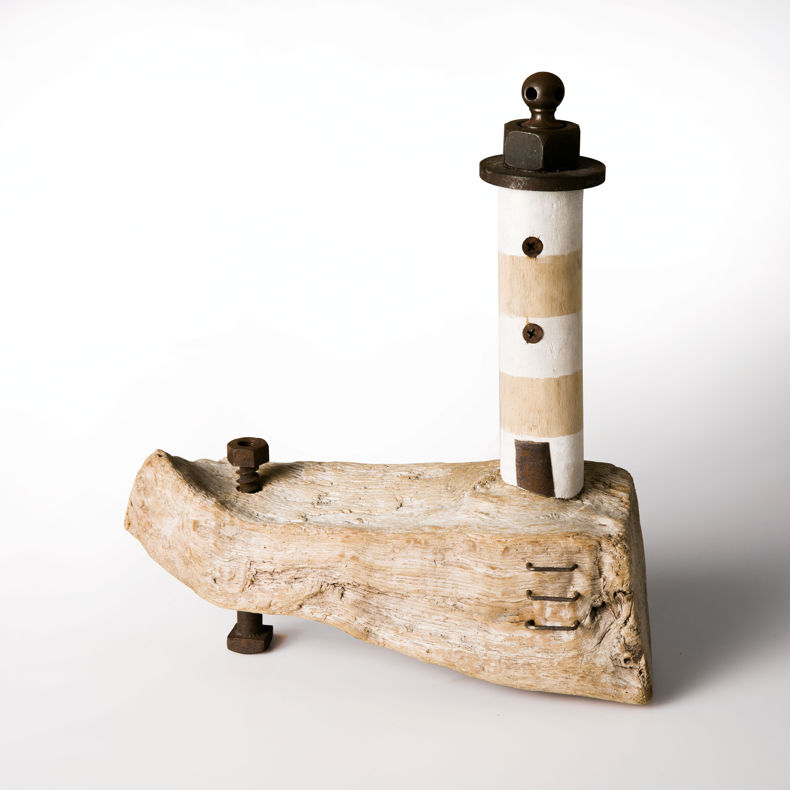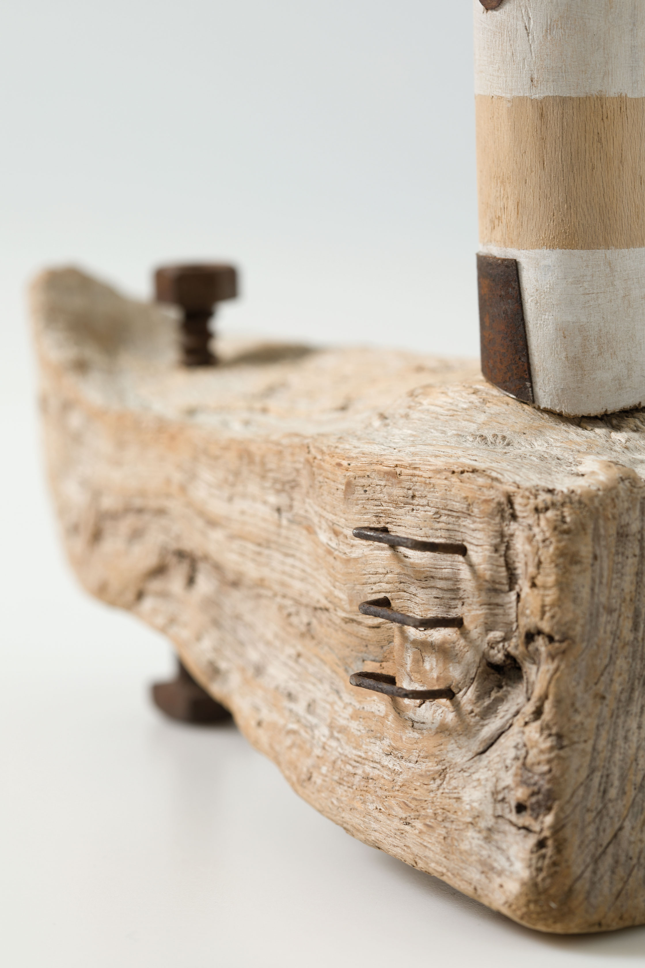 Pour Claudio et Juan, les artistes derrière Flotboats, la création vient de l’expérimentation. « Le bois est un matériau parfait pour cela. Toujours unique et différent », affirment-ils. Et dans cette pièce, El faro en la isla, ils se prennent aussi au jeu. Avec du bois de drift, des pièces de métal réutilisées (vis, écrous, fils qui ont eu une vie antérieure) et de la peinture acrylique, ils ont créé une petite île qui cherche l’équilibre, montant et descendant au rythme des marées. Flottant dans une mer qu’on ne voit pas, mais qu’on devine. La mer, toujours la mer.