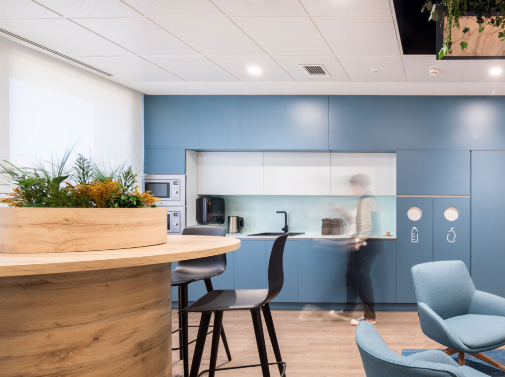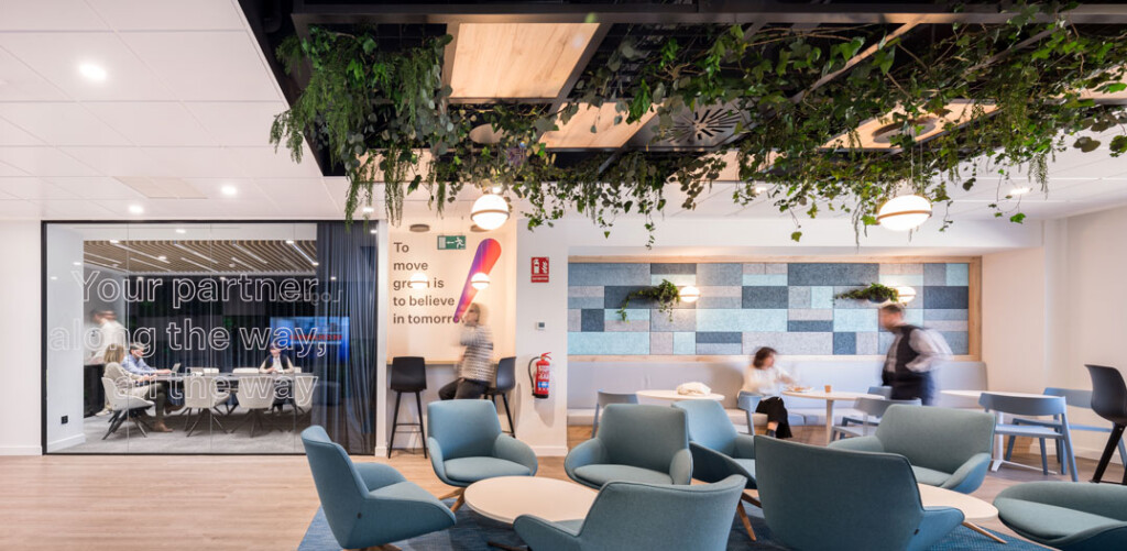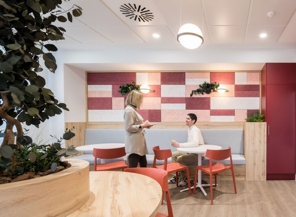 Les nouveaux bureaux disposent de zones de café et de réunions informelles publiques situées dans des endroits plus ouverts, où des panneaux de fibres phoniques absorbants ont été placés pour contrôler les niveaux de bruit. En général, tout le projet est conçu avec des matériaux dont un pourcentage élevé des composants est d’origine recyclée et qui ont été fabriqués selon des processus de fabrication durables et certifiés.