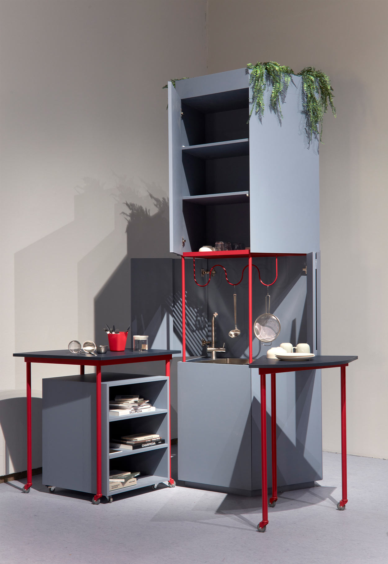 Lié à cette fonctionnalité, nous détectons que les roues se sont installées, pour modifier l’habitat à notre guise. Dans la cuisine, cela se traduit par des îlots mobiles, mais nous voyons aussi des exemples de mobilier qui peut être déplacé où nous le souhaitons.