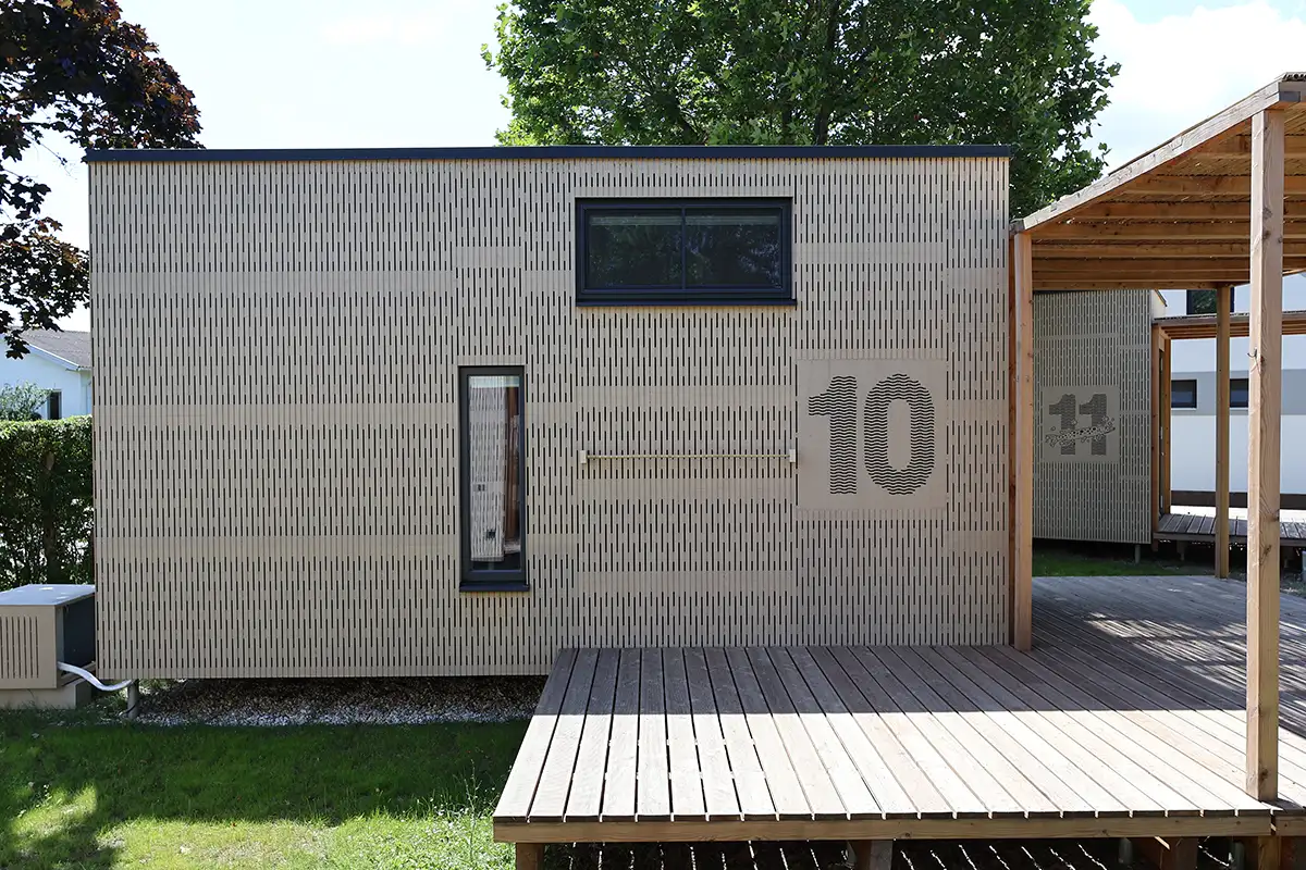 Uno de los elementos más distintivos del proyecto es su fachada, fabricada en Tricoya, un material derivado de la madera acetilada que destaca por su resistencia a la humedad, durabilidad y estabilidad dimensional. “Necesitábamos un producto que nos permitiera realizar fresados complejos y formas geométricas sin comprometer el rendimiento a largo plazo”, explica Dabic. Tricoya también encajó con su enfoque de diseño digital, permitiendo la creación de una envolvente visualmente potente y funcional.